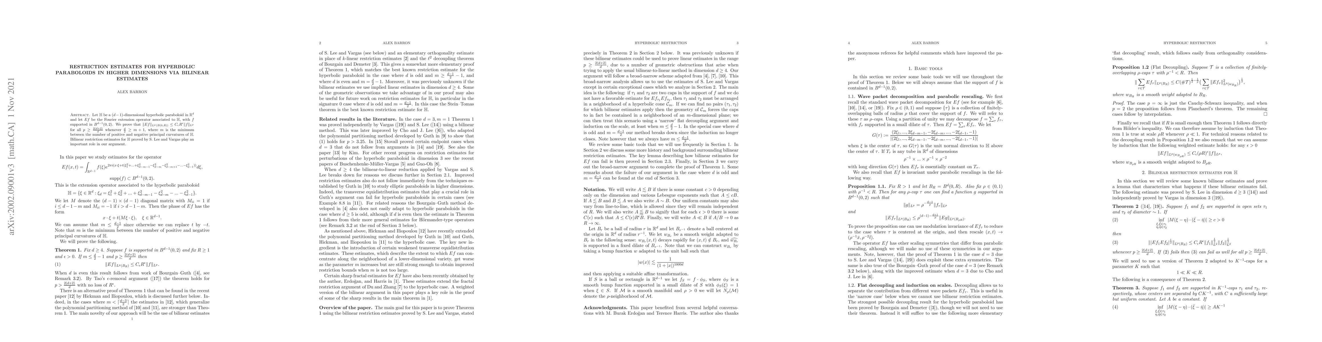 This paper establishes restriction estimates for hyperboloids in higher dimensions using bilinear estimates, proving that the Fourier extension operator associated with a $(d-1)$-dimensional hyperbolic paraboloid satisfies $\|Ef\|_{L^p (B(0,R))} \leq C_{\epsilon}R^{\epsilon}\|f\|_{L^p}$ for specific $p$ values, leveraging results from S. Lee and Vargas's bilinear restriction estimates.
