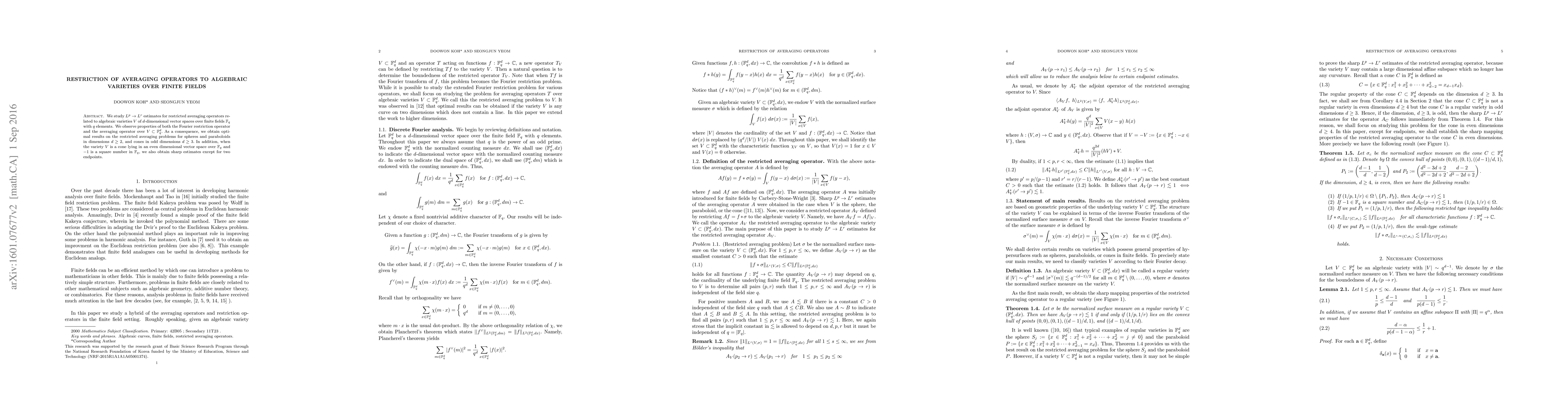 This paper investigates $L^p\to L^r$ estimates for averaging operators associated with algebraic varieties over finite fields, focusing on Fourier restriction and averaging properties. Optimal results are derived for restricted averaging problems in dimensions $d\ge2$ for spheres and paraboloids, and cones in odd dimensions $d\ge3$, with sharp estimates achieved under specific conditions for cones in even dimensions.