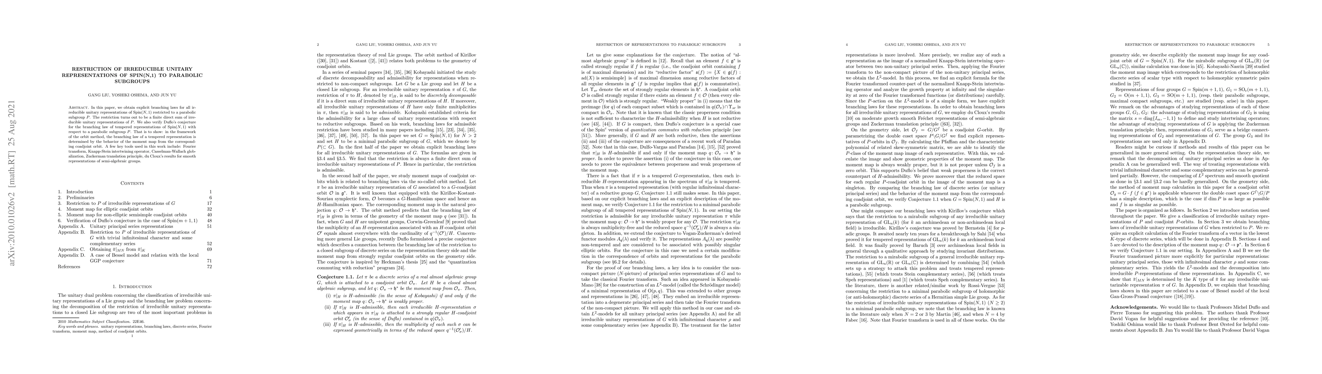 The paper establishes branching laws for irreducible unitary representations of Spin(N,1) restricted to parabolic subgroups, verifying Duflo's conjecture and providing a finite direct sum of irreducible unitary representations.