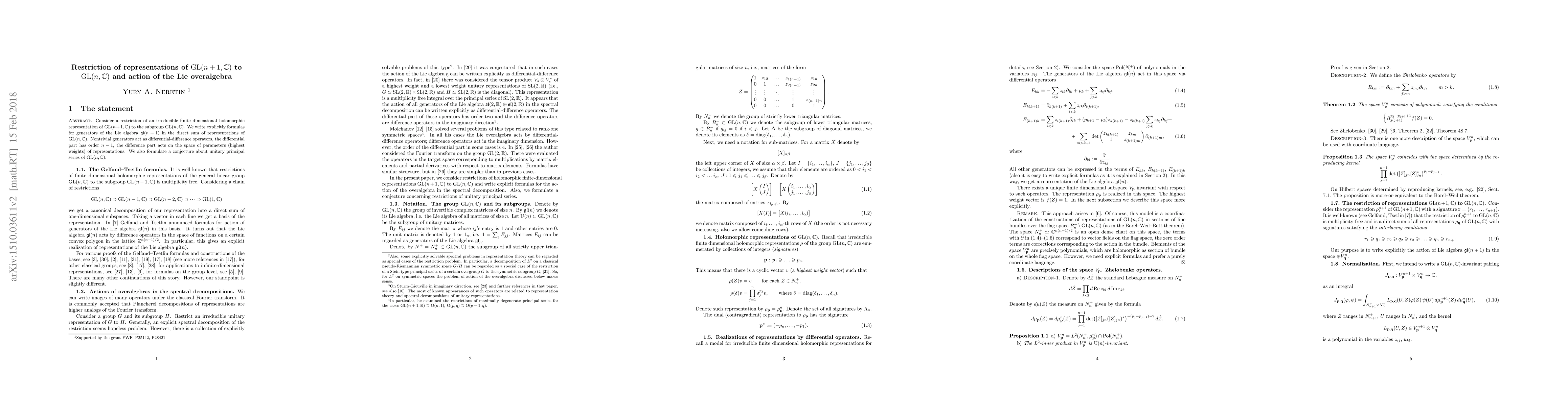 This paper explores the restriction of irreducible finite-dimensional holomorphic representations of $\GL(n+1,\mathbb{C})$ to $\GL(n,\mathbb{C})$, using the Gelfand-Tsetlin branching rule. It provides explicit formulas for generators of $gl(n+1)$ acting as differential-difference operators, and formulates a conjecture regarding the unitary principal series of $\GL(n,\mathbb{C})$.