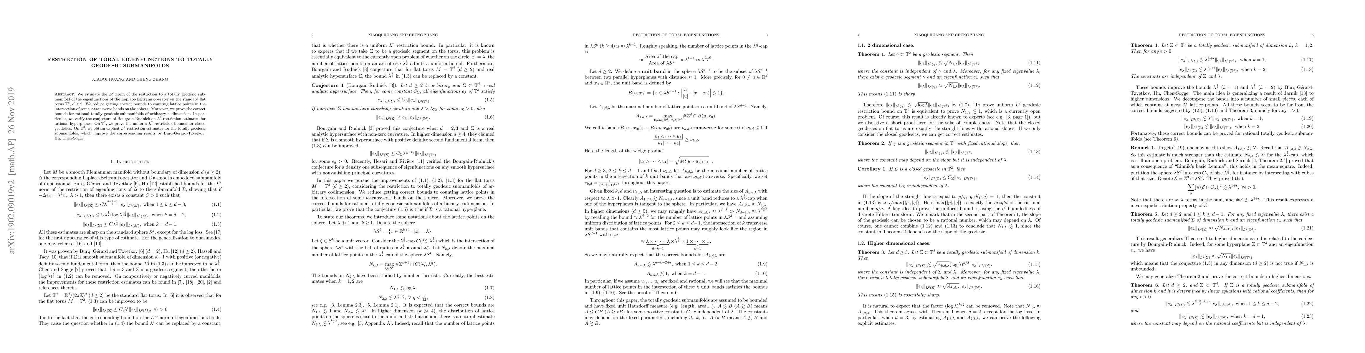 We estimate the $L^2$ norm of the restriction to a totally geodesic submanifold of the eigenfunctions of the Laplace-Beltrami operator on the standard flat torus $\mathbb{T}^d$, $d\ge2$. We reduce getting correct bounds to counting lattice points in the intersection of some $\nu$-transverse bands on the sphere. Moreover, we prove the correct bounds for rational totally geodesic submanifolds of arbitrary codimension. In particular, we verify the conjecture of Bourgain-Rudnick on $L^2$-restriction estimates for rational hyperplanes. On $\mathbb{T}^2$, we prove the uniform $L^2$ restriction bounds for closed geodesics. On $\mathbb{T}^3$, we obtain explicit $L^2$ restriction estimates for the totally geodesic submanifolds, which improve the corresponding results by Burq-G\'erard-Tzvetkov, Hu, Chen-Sogge.