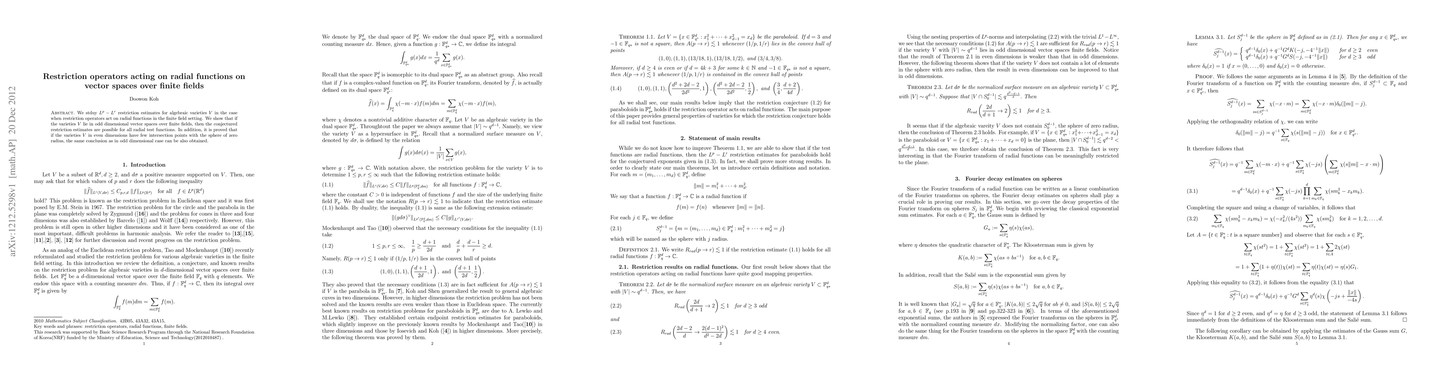 Summary: This paper investigates $L^p-L^r$ restriction estimates for algebraic varieties in finite field settings when acting on radial functions. It confirms the conjectured estimates for odd-dimensional varieties and demonstrates similar results for even-dimensional varieties with few zero-radius sphere intersections.