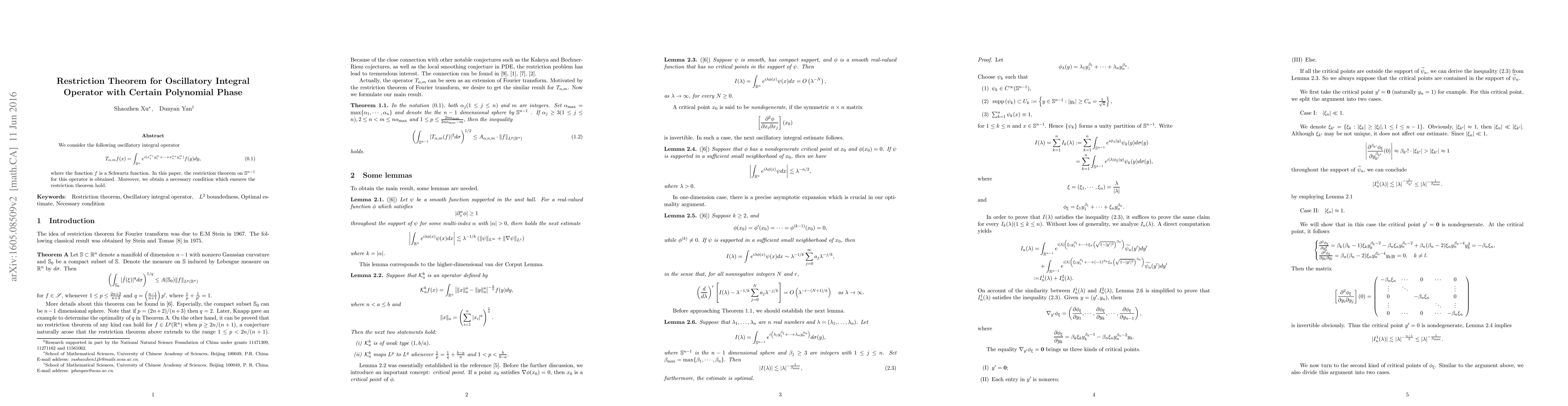 We consider the following oscillatory integral operator \begin{equation}\label{opera-defi-1} T_{\alpha,m}f(x)=\int_{\mathbb R^n}e^{i(x_1^{\alpha_1} y_1^m+\cdots+x_n^{\alpha_n} y_n^m)}f(y)dy, \end{equation} where the function $f$ is a Schwartz function. In this paper, the restriction theorem on $\mathbb{S}^{n-1}$ for this operator is obtained. Moreover, we obtain a necessary condition which ensures the restriction theorem hold.