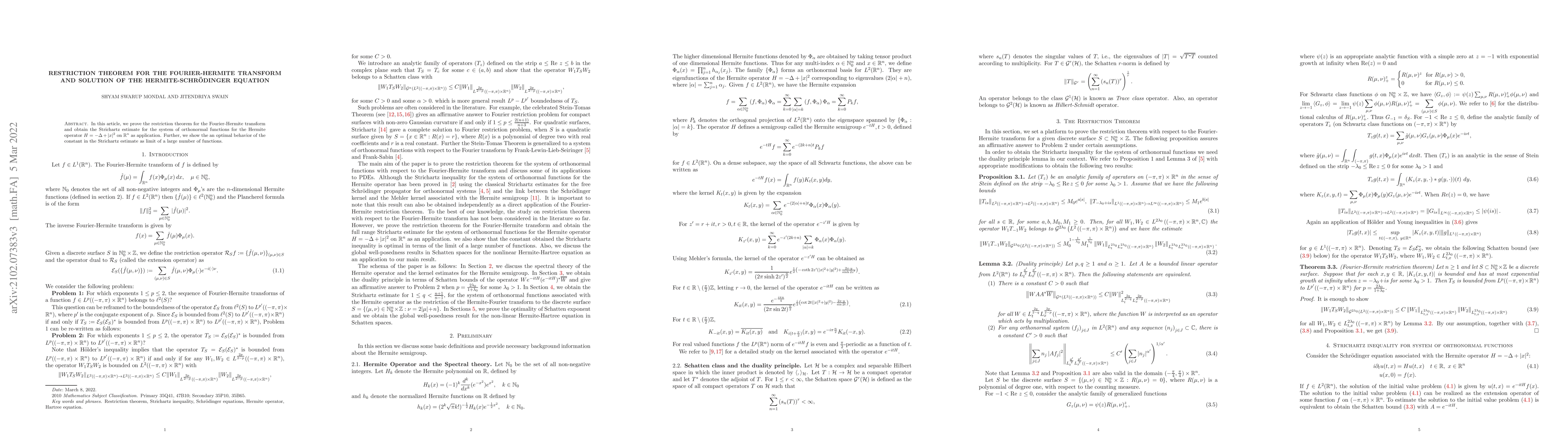 This paper proves the restriction theorem for the Fourier-Hermite transform and derives the Strichartz estimate for orthonormal functions associated with the Hermite operator. It also demonstrates the optimal behavior of the constant in the Strichartz estimate as the number of functions increases.