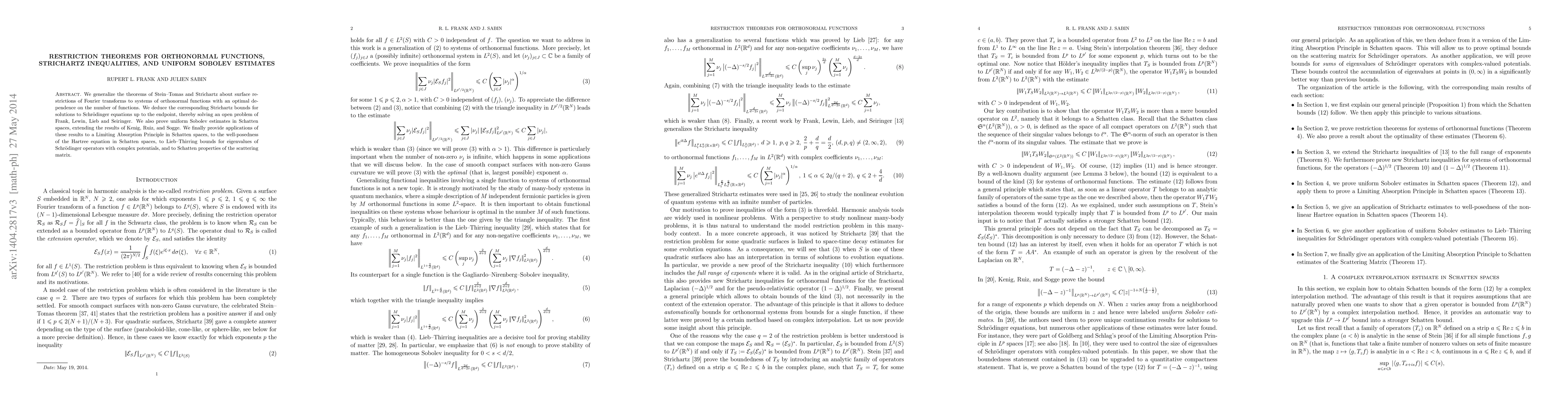 This paper generalizes Stein-Tomas and Strichartz restriction theorems for orthonormal functions, deriving optimal Strichartz bounds for Schrödinger equation solutions and proving uniform Sobolev estimates. It also applies these results to various problems including well-posedness of the Hartree equation and eigenvalue bounds for Schrödinger operators.