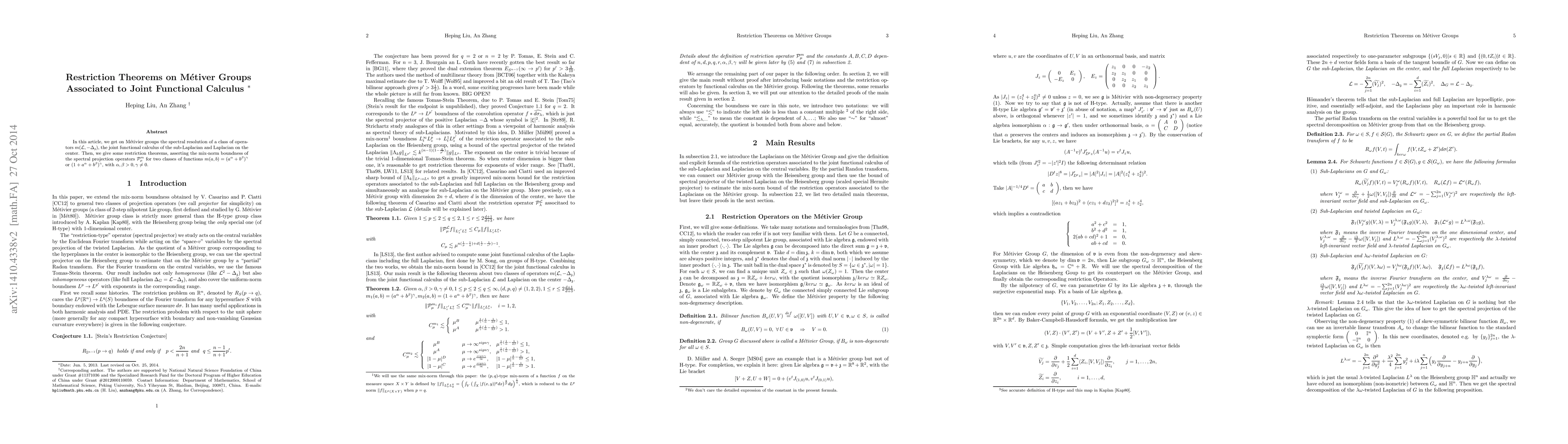 This paper derives the spectral solution $\mathcal{P}_{\mu}^{m}$ for operators involving joint functional calculus on M\'etivier groups. It establishes group-analogues of the Thomas-Stein restriction theorem, proving the mixed-norm boundedness of the restriction operators $\mathcal{P}_{\mu}^{m}$ for specific function classes $m$.