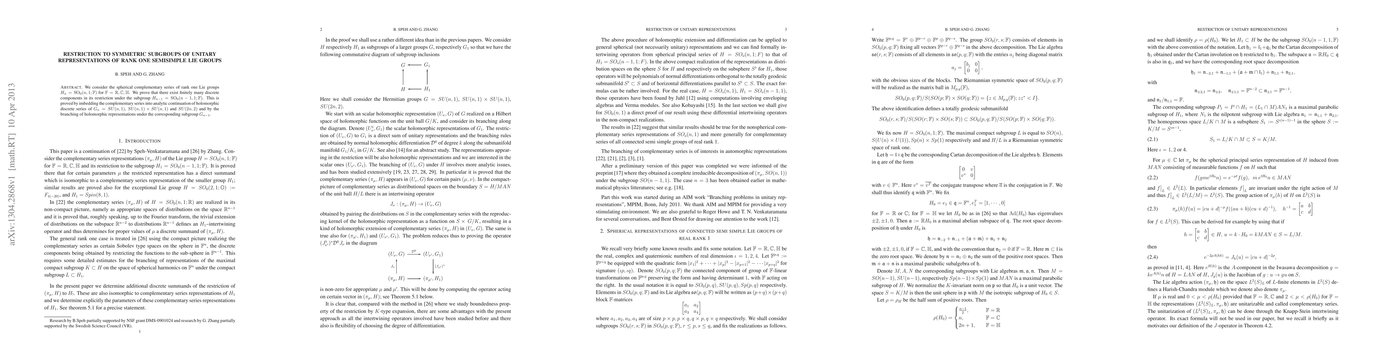 This paper proves that for certain Lie groups, there are only finitely many discrete components in their spherical complementary series when restricted to a smaller subgroup. It uses analytic continuation of holomorphic representations and branching under subgroups to make this argument.
