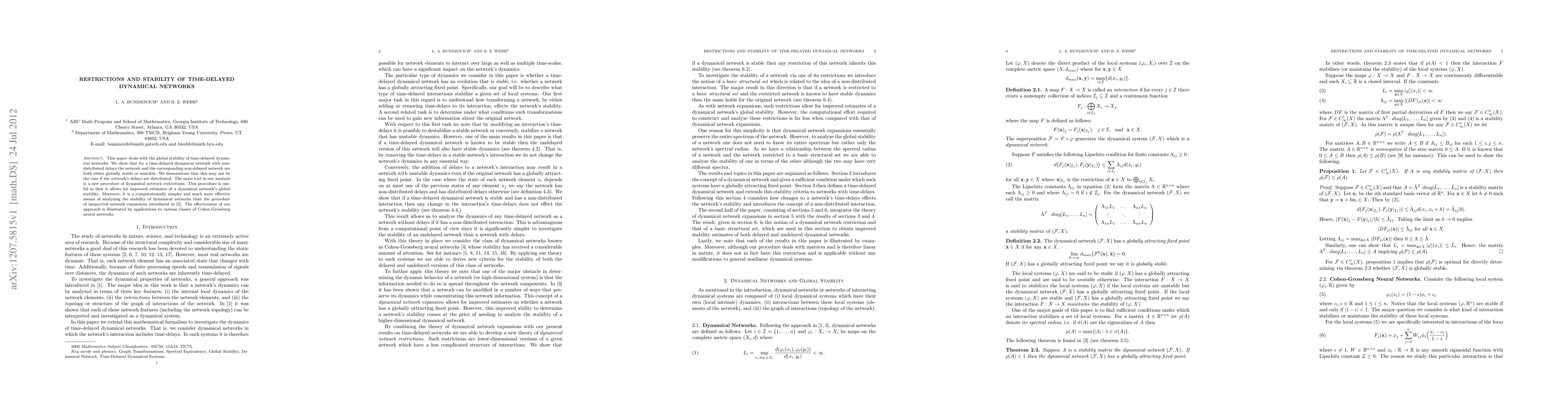 This paper deals with the global stability of time-delayed dynamical networks. We show that for a time-delayed dynamical network with non-distributed delays the network and the corresponding non-delayed network are both either globally stable or unstable. We demonstrate that this may not be the case if the network's delays are distributed. The main tool in our analysis is a new procedure of dynamical network restrictions. This procedure is useful in that it allows for improved estimates of a dynamical network's global stability. Moreover, it is a computationally simpler and much more effective means of analyzing the stability of dynamical networks than the procedure of isospectral network expansions introduced in [Isospectral graph transformations, spectral equivalence, and global stability of dynamical networks. Nonlinearity, 25 (2012) 211-254]. The effectiveness of our approach is illustrated by applications to various classes of Cohen-Grossberg neural networks.