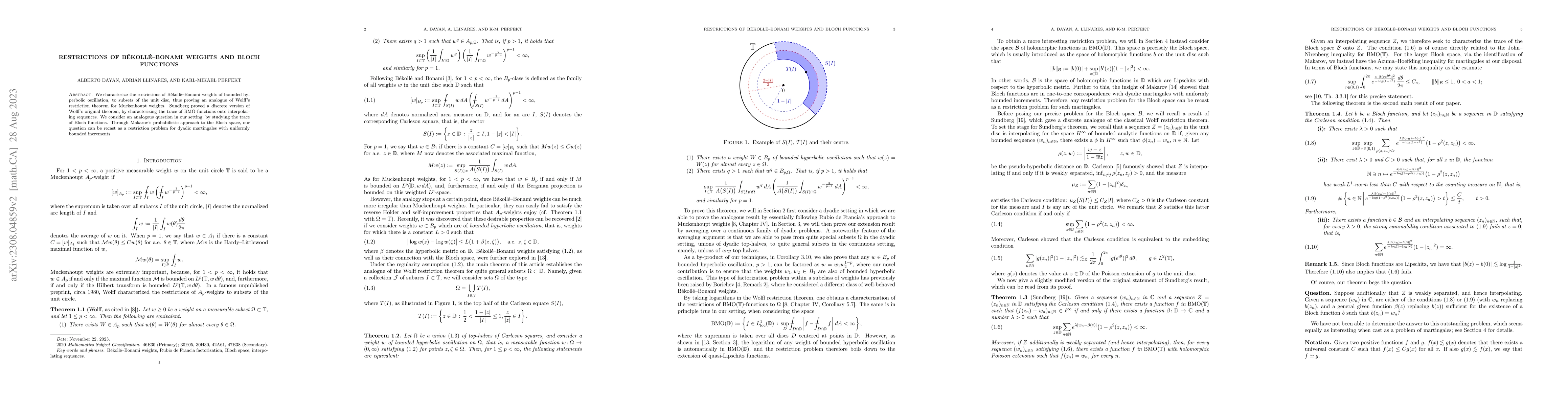 This paper characterizes the restrictions of B\'ekoll\'e--Bonami weights to subsets of the unit disc, establishing an analogue of Wolff's restriction theorem for Muckenhoupt weights. It also explores the trace of Bloch functions, recasting the problem as a restriction problem for dyadic martingales with uniformly bounded increments.