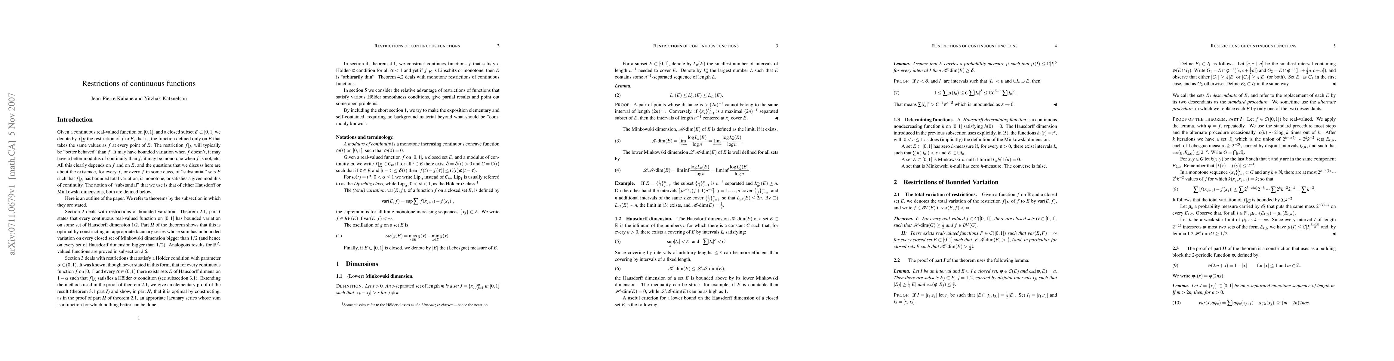 Given a continuous real-valued function on [0, 1], and a closed subset E \subset [0, 1] we denote by f E the restriction of f to E, that is, the function defined only on E that takes the same values as f at every point of E >. The restriction f E will typically be "better behaved" than f . It may have bounded variation when f doesn't, it may have a better modulus of continuity than f, it may be monotone when f is not, etc. All this clearly depends on f and on E, and the questions that we discuss here are about the existence, for every f, or every f in some class, of "substantial" sets E such that f E has bounded total variation, is monotone, or satisfies a given modulus of continuity. The notion of "substantial" that we use is that of either Hausdorff or Minkowski dimensions.