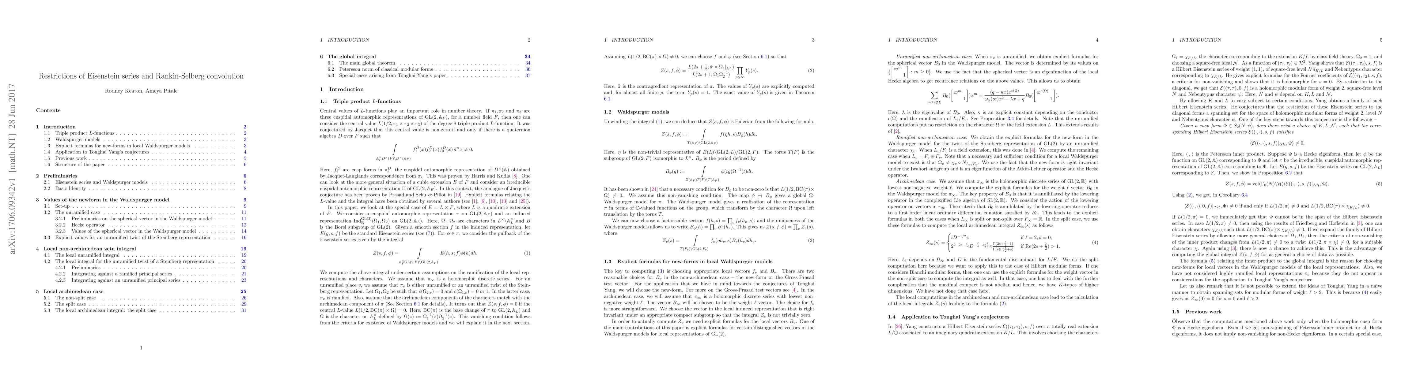 In a 2005 paper, Yang constructed families of Hilbert Eisenstein series, which when restricted to the diagonal are conjectured to span the underlying space of elliptic modular forms. One approach to these conjectures is to show the non-vanishing of an inner product of elliptic eigenforms with the restrictions of Eisenstein series. In this paper, we compute this inner product locally by using explicit values of new vectors in the Waldspurger model.