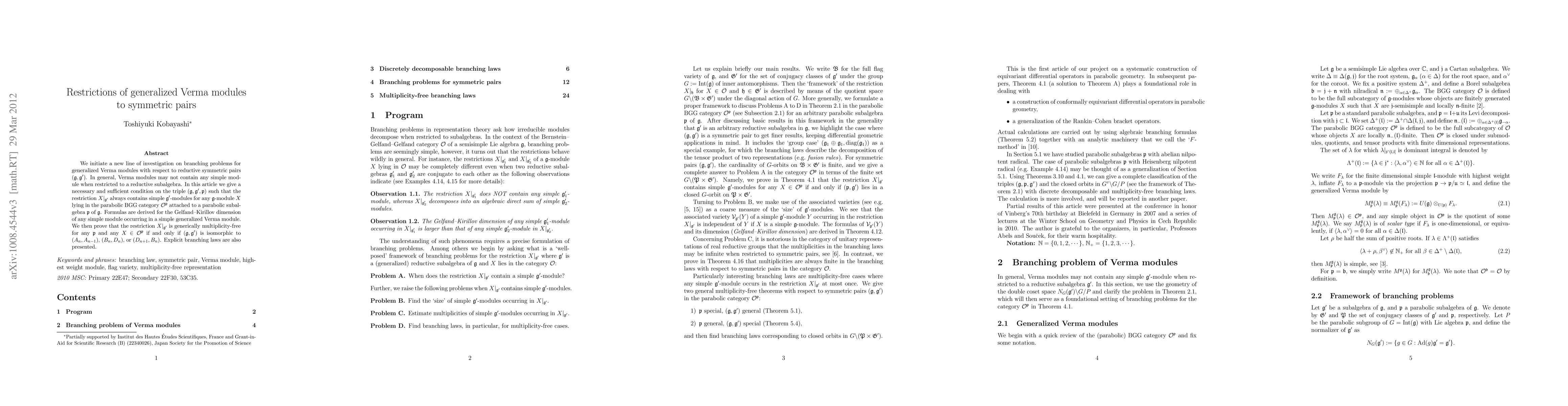 This paper investigates branching problems for generalized Verma modules with respect to complex reductive symmetric pairs, deriving conditions for the presence of simple k-modules in the restriction. It provides a necessary and sufficient condition for multiplicity-free restrictions and presents explicit branching laws for specific symmetric pairs.