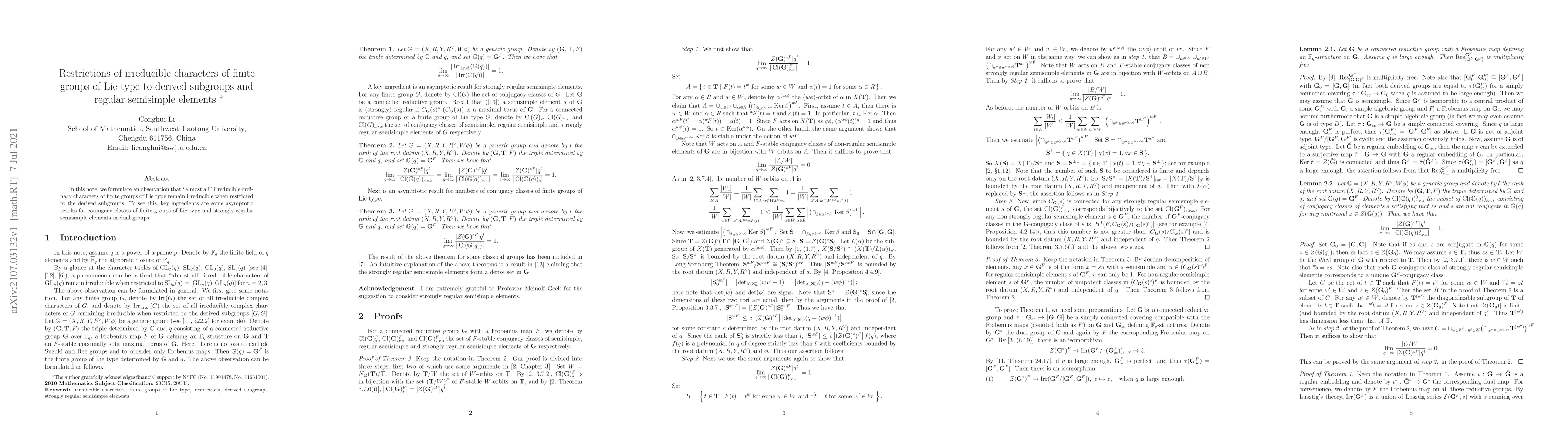 Summary: This note observes that most irreducible ordinary characters of finite groups of Lie type stay irreducible when restricted to derived subgroups, utilizing asymptotic results on conjugacy classes and properties of strongly regular semisimple elements in dual groups.