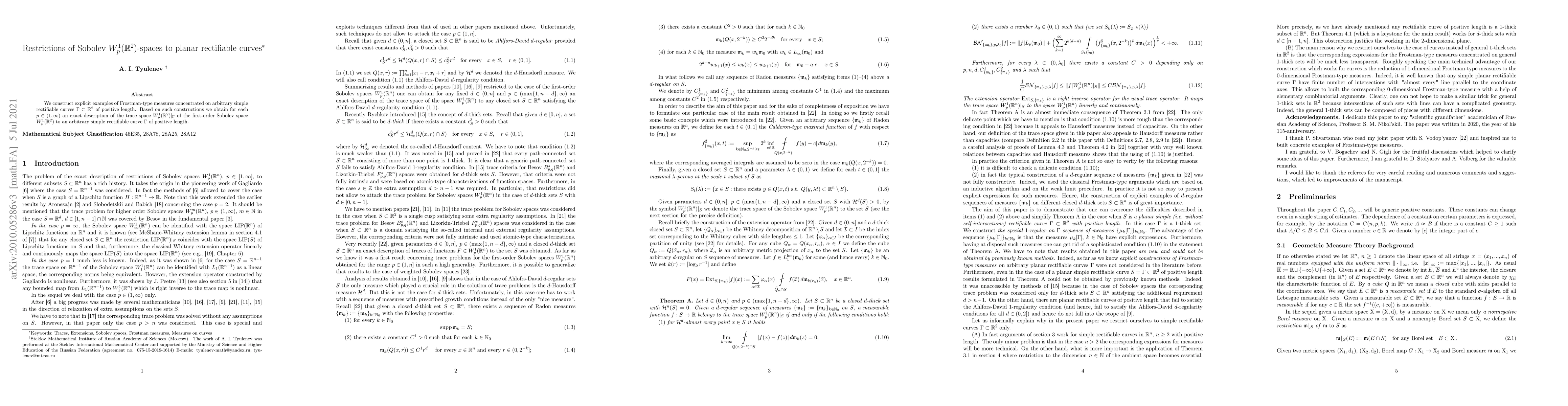 We construct explicit examples of Frostman-type measures concentrated on arbitrary planar rectifiable curves of positive length. Based on such constructions we obtain for each $p \in (1,\infty)$ an exact description of the trace space of the first-order Sobolev space $W^{1}_{p}(\mathbb{R}^{2})$ to an arbitrary planar rectifiable curve $\Gamma \subset \mathbb{R}^{2}$ of positive length.