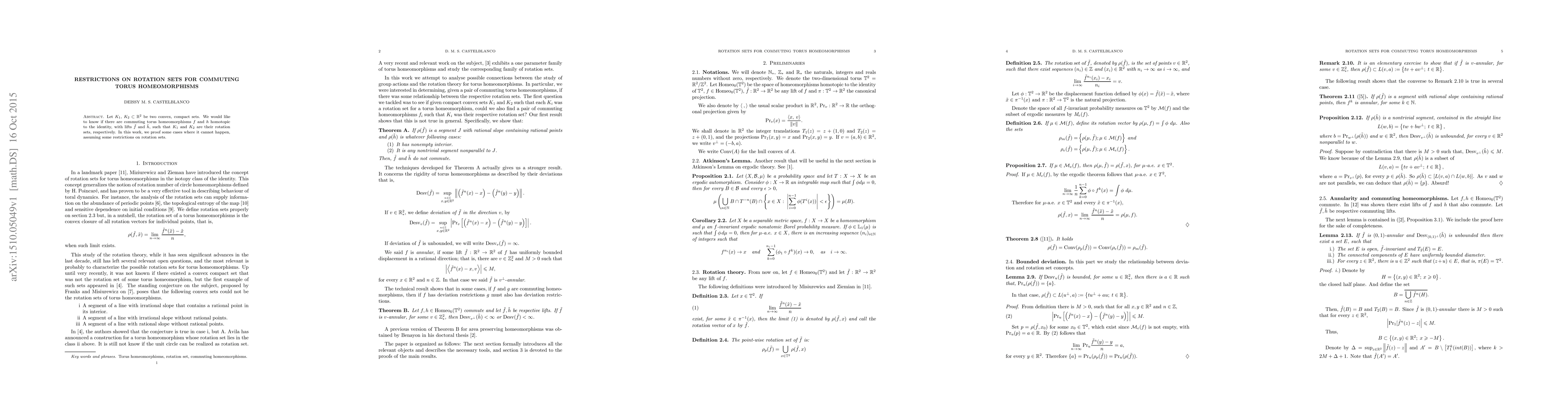 This paper proves that under certain restrictions on rotation sets, there do not exist commuting torus homeomorphisms homotopic to the identity with specified convex, compact sets as their rotation sets. It explores the conditions under which such homeomorphisms cannot coexist.
