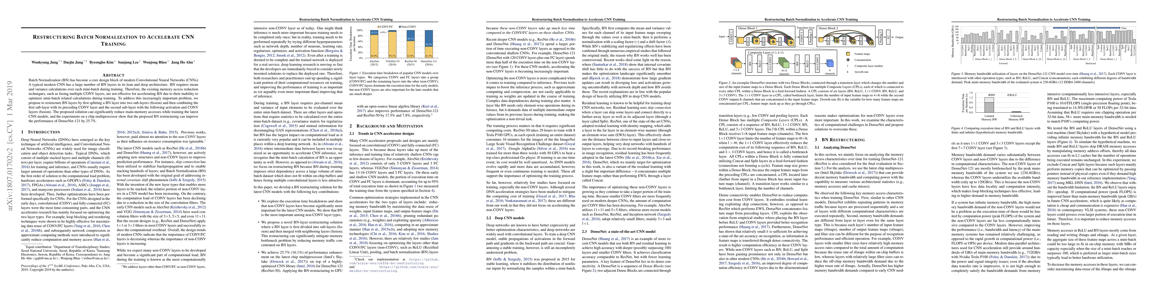 This paper proposes restructuring Batch Normalization (BN) layers in CNNs by splitting and fusing them with adjacent layers to optimize memory access during training. The method improves the performance of DenseNet-121 by 25.7% on a chip multiprocessor, demonstrating significant acceleration in CNN training.