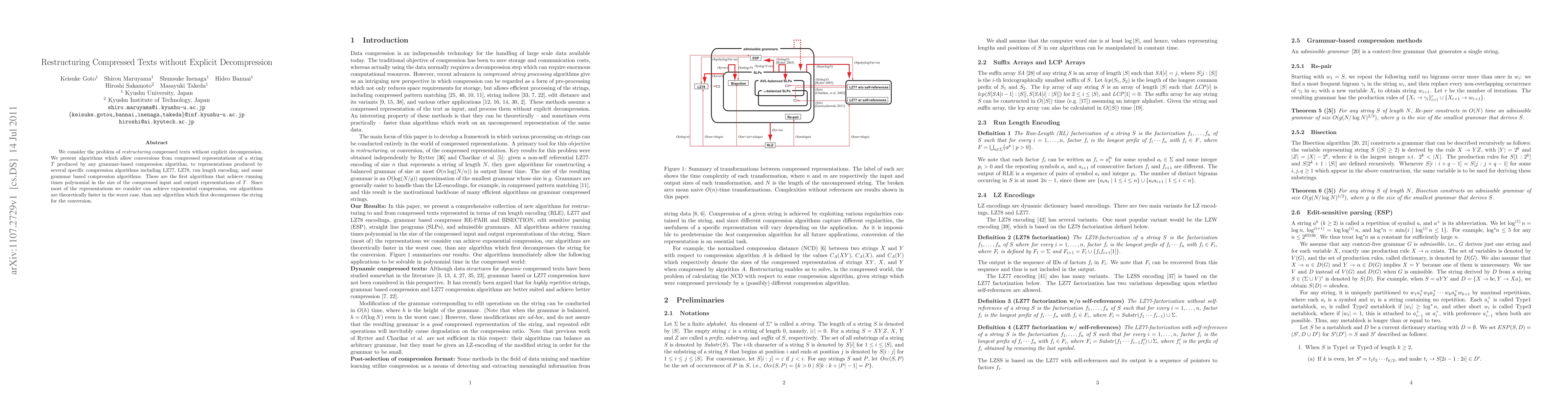 We consider the problem of {\em restructuring} compressed texts without explicit decompression. We present algorithms which allow conversions from compressed representations of a string $T$ produced by any grammar-based compression algorithm, to representations produced by several specific compression algorithms including LZ77, LZ78, run length encoding, and some grammar based compression algorithms. These are the first algorithms that achieve running times polynomial in the size of the compressed input and output representations of $T$. Since most of the representations we consider can achieve exponential compression, our algorithms are theoretically faster in the worst case, than any algorithm which first decompresses the string for the conversion.
