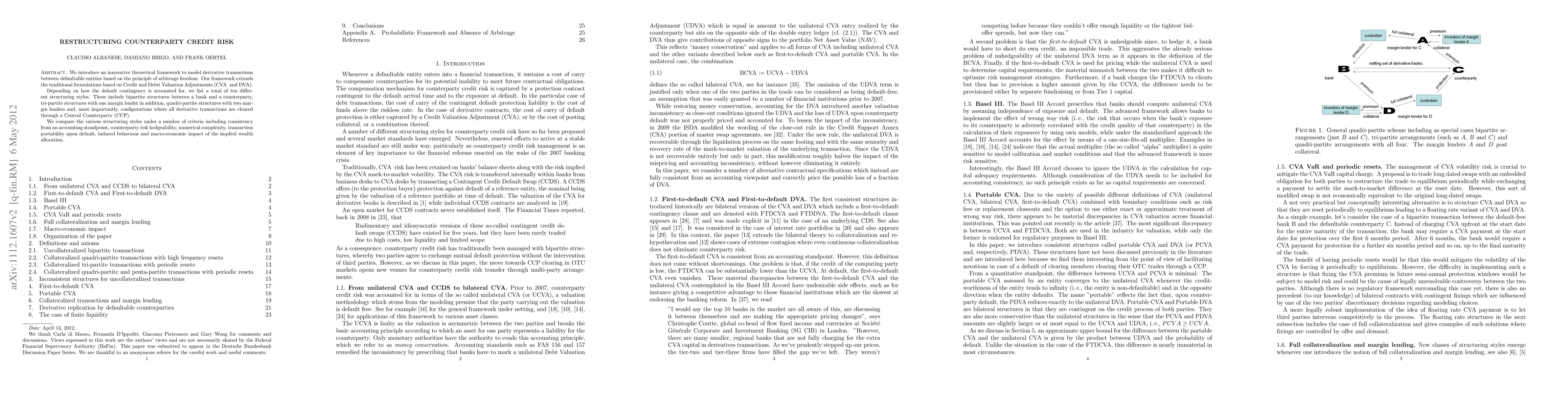 We introduce an innovative theoretical framework to model derivative transactions between defaultable entities based on the principle of arbitrage freedom. Our framework extends the traditional formulations based on Credit and Debit Valuation Adjustments (CVA and DVA). Depending on how the default contingency is accounted for, we list a total of ten different structuring styles. These include bipartite structures between a bank and a counterparty, tri-partite structures with one margin lender in addition, quadri-partite structures with two margin lenders and, most importantly, configurations where all derivative transactions are cleared through a Central Counterparty (CCP). We compare the various structuring styles under a number of criteria including consistency from an accounting standpoint, counterparty risk hedgeability, numerical complexity, transaction portability upon default, induced behaviour and macro-economic impact of the implied wealth allocation.