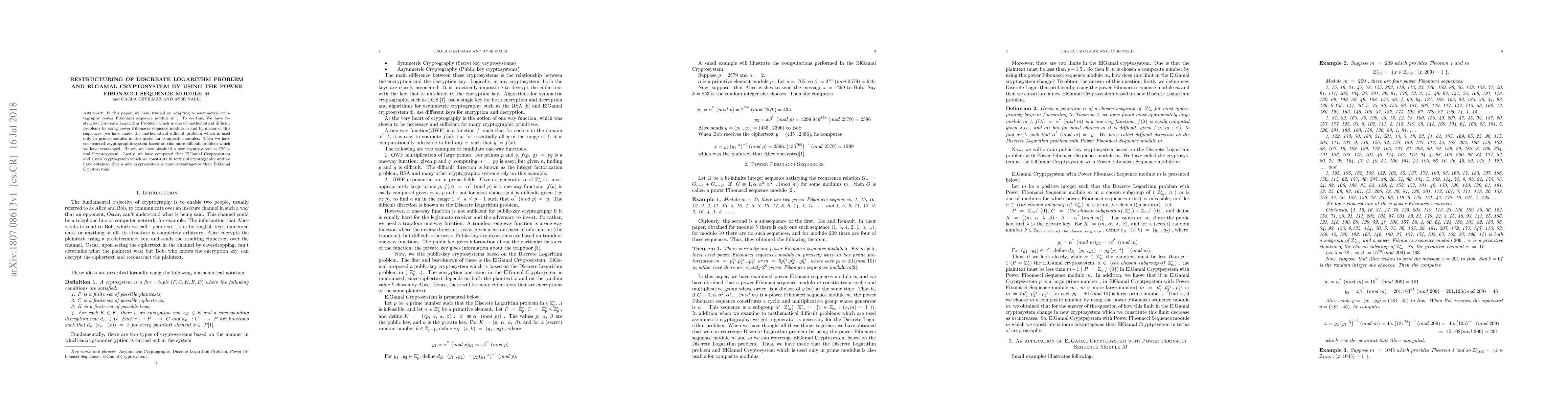 In this paper, we have studied on adapting to asymmetric cryptography power Fibonacci sequence module m . To do this, We have restructed Discreate Logarithm Problem which is one of mathematical difficult problems by using power Fibonacci sequence module m and by means of this sequences, we have made the mathematical difficult problem which is used only in prime modules is also useful for composite modules. Then we have constructed cryptographic system based on this more difficult problem which we have rearranged. Hence, we have obtained a new cryptosystem as ElGamal Cryptosystem. Lastly, we have compared that ElGamal Cryptosystem and a new cryptosystem which we constitute in terms of cryptography and we have obtained that a new cryptosystem is more advantageuos than ElGamal Cryptosystem.