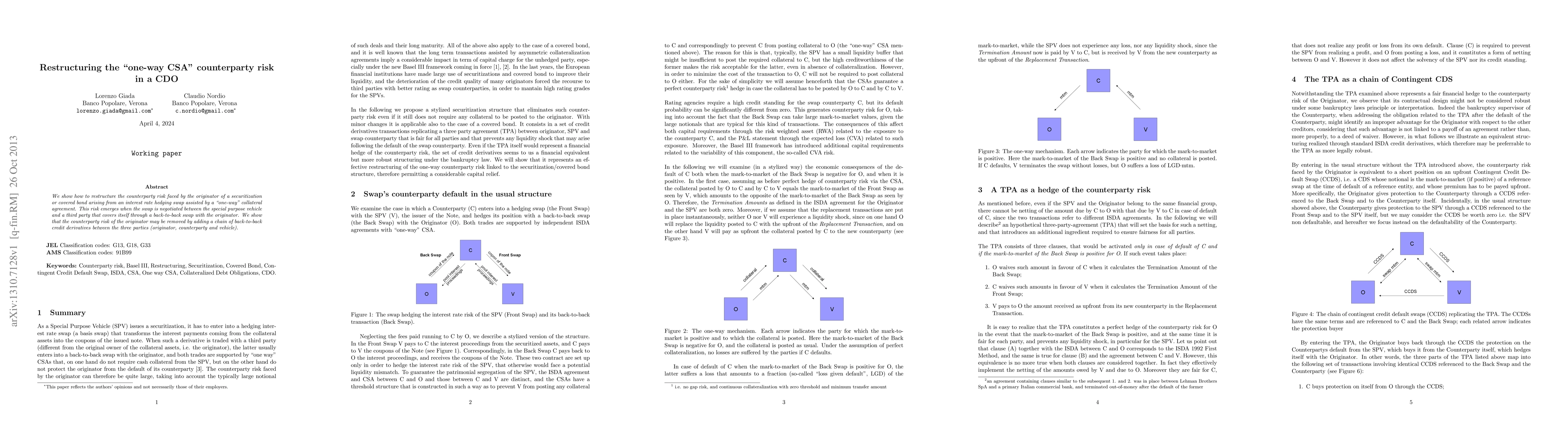 We show how to restructure the counterparty risk faced by the originator of a securitization or covered bond arising from an interest rate hedging swap assisted by a "one-way" collateral agreement. This risk emerges when the swap is negotiated between the special purpose vehicle and a third party that covers itself through a back-to-back swap with the originator. We show that the counterparty risk of the originator may be removed by adding a chain of back-to-back credit derivatives between the three parties (originator, counterparty and vehicle).