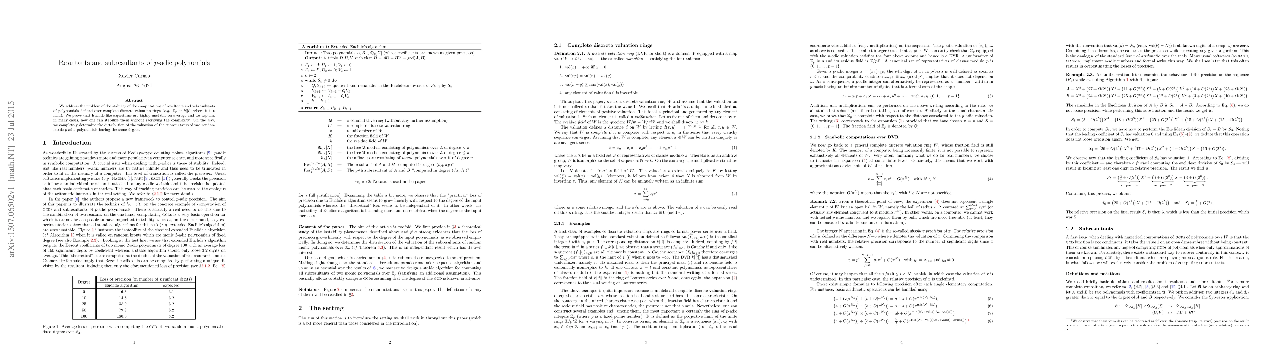 This paper investigates the stability of computing resultants and subresultants of p-adic polynomials, demonstrating that traditional algorithms are unstable but proposing methods to stabilize them without increasing complexity. It also determines the distribution of the valuation of principal subresultants for random monic p-adic polynomials of the same degree.