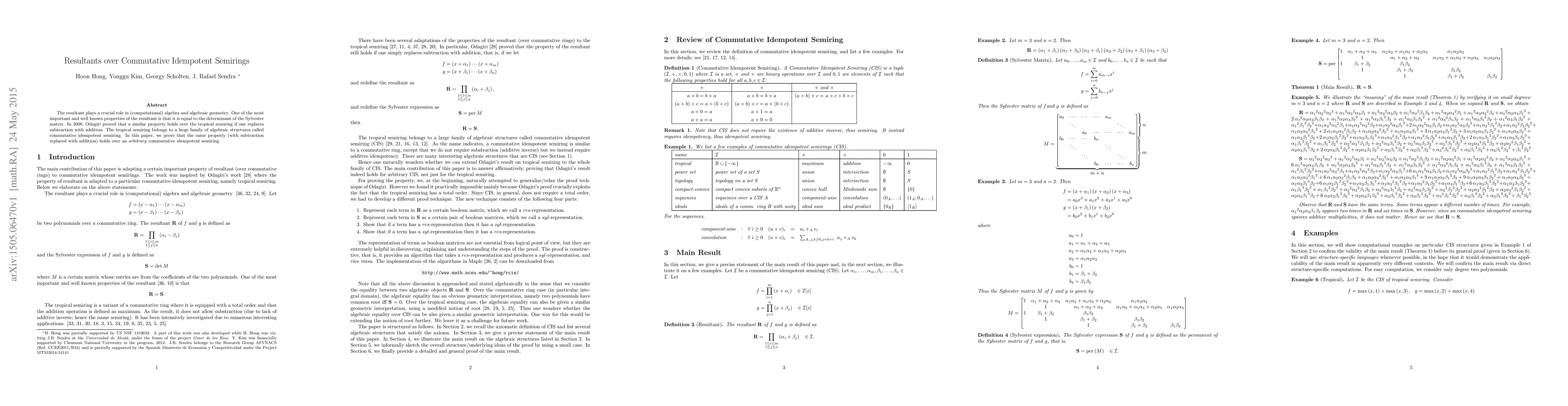 The resultant plays a crucial role in (computational) algebra and algebraic geometry. One of the most important and well known properties of the resultant is that it is equal to the determinant of the Sylvester matrix. In 2008, Odagiri proved that a similar property holds over the tropical semiring if one replaces subtraction with addition. The tropical semiring belongs to a large family of algebraic structures called commutative idempotent semiring. In this paper, we prove that the same property (with subtraction replaced with addition) holds over an \emph{arbitrary\/} commutative idempotent semiring.
