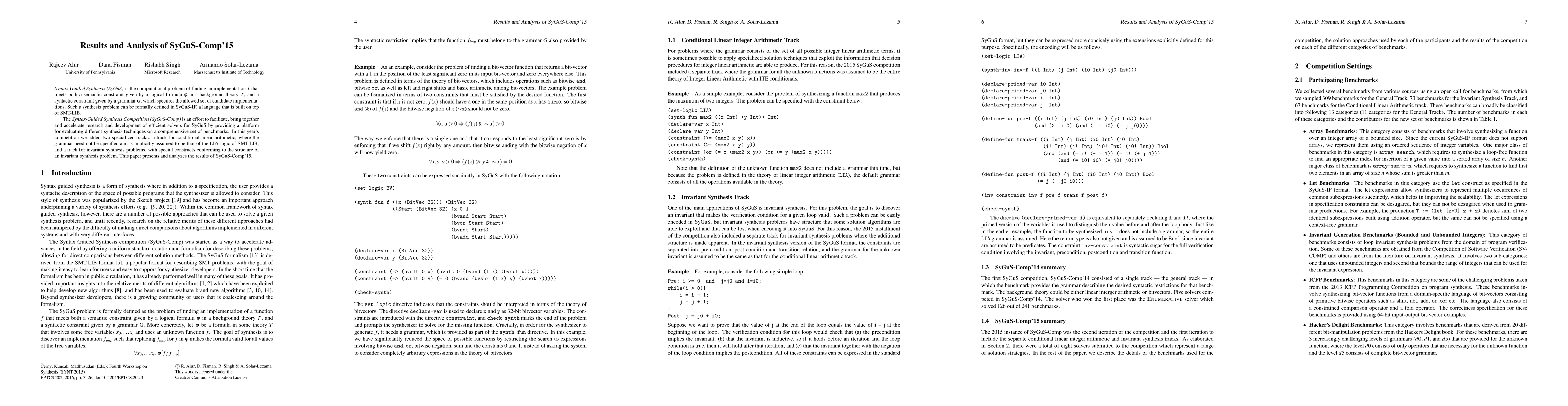 The Syntax-Guided Synthesis Competition (SyGuS-Comp'15) evaluated different synthesis techniques on a comprehensive set of benchmarks, including specialized tracks for conditional linear arithmetic and invariant synthesis problems.