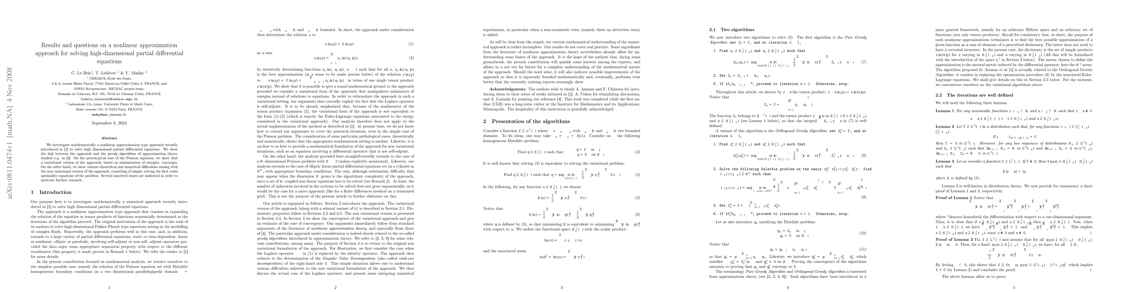 This paper explores a nonlinear approximation method for solving high-dimensional partial differential equations, linking it to greedy algorithms and demonstrating variational convergence for the Poisson equation while highlighting challenges in the non-variational version. It identifies several open questions to spur future research.