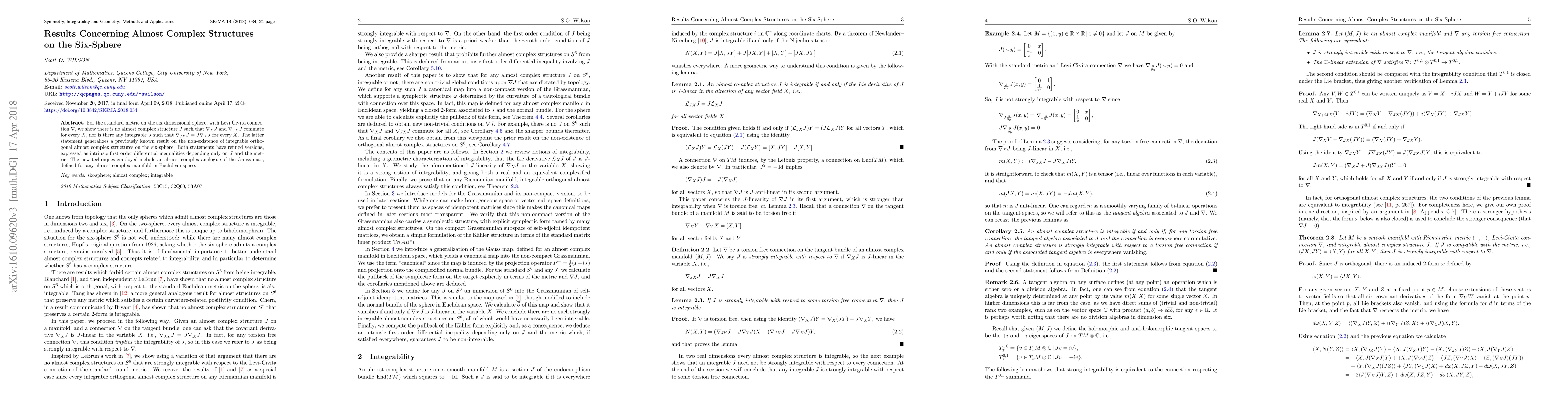 For the standard metric on the six-dimensional sphere, with Levi-Civita connection $\nabla$, we show there is no almost complex structure $J$ such that $\nabla_X J$ and $\nabla_{JX} J$ commute for every $X$, nor is there any integrable $J$ such that $\nabla_{JX} J = J \nabla_X J$ for every $X$. The latter statement generalizes a previously known result on the non-existence of integrable orthogonal almost complex structures on the six-sphere. Both statements have refined versions, expressed as intrinsic first order differential inequalities depending only on $J$ and the metric. The new techniques employed include an almost-complex analogue of the Gauss map, defined for any almost complex manifold in Euclidean space.