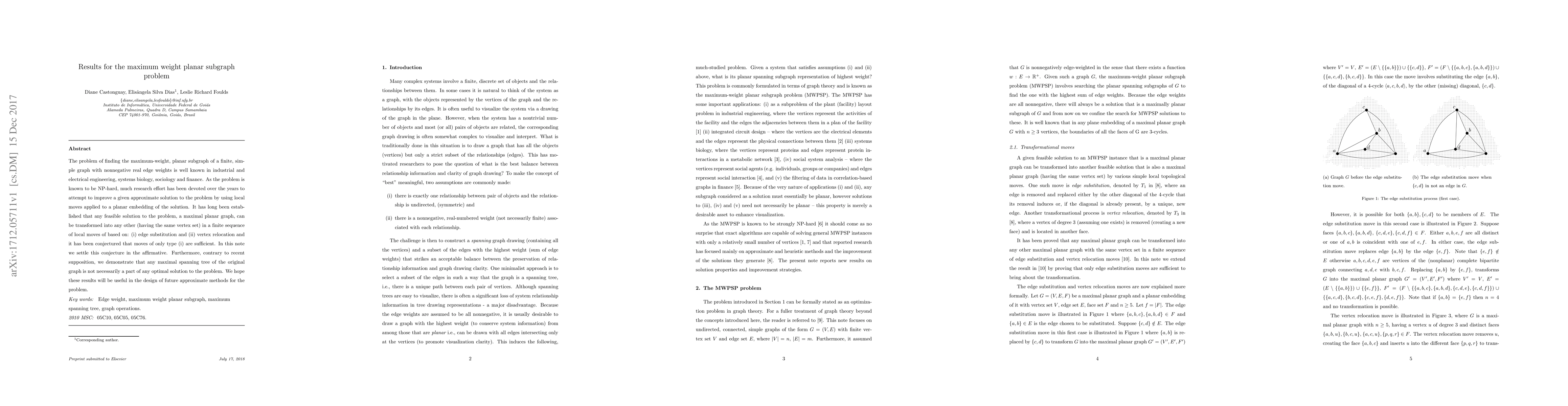The problem of finding the maximum-weight, planar subgraph of a finite, simple graph with nonnegative real edge weights is well known in industrial and electrical engineering, systems biology, sociology and finance. As the problem is known to be NP-hard, much research effort has been devoted over the years to attempt to improve a given approximate solution to the problem by using local moves applied to a planar embedding of the solution. It has long been established that any feasible solution to the problem, a maximal planar graph, can be transformed into any other (having the same vertex set) in a finite sequence of local moves of based on: (i) edge substitution and (ii) vertex relocation and it has been conjectured that moves of only type (i) are sufficient. In this note we settle this conjecture in the affirmative. Furthermore, contrary to recent supposition, we demonstrate that any maximal spanning tree of the original graph is not necessarily a part of any optimal solution to the problem. We hope these results will be useful in the design of future approximate methods for the problem.