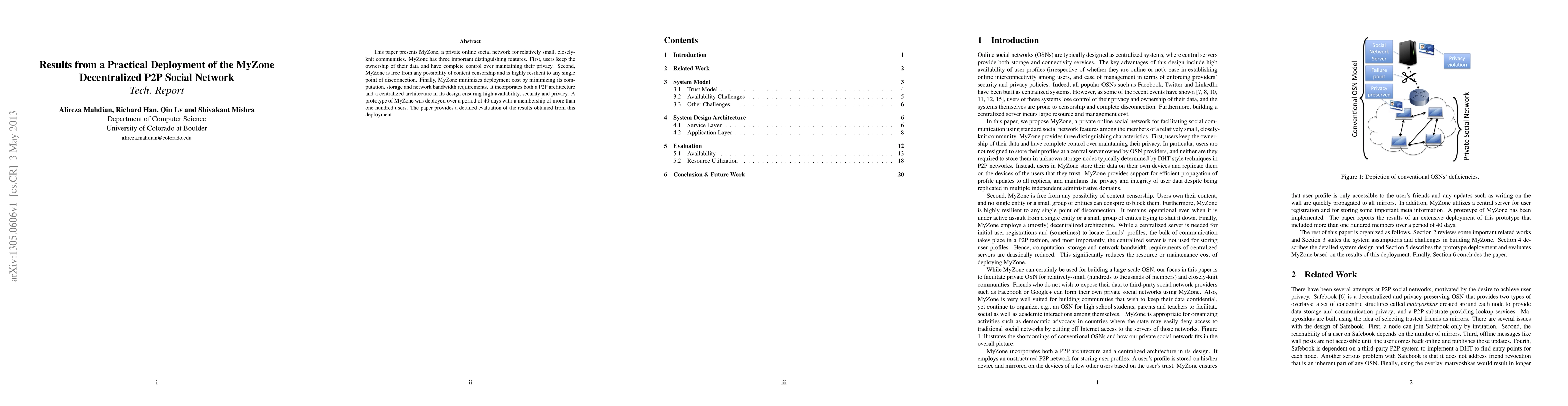 This paper presents MyZone, a private online social network for relatively small, closely-knit communities. MyZone has three important distinguishing features. First, users keep the ownership of their data and have complete control over maintaining their privacy. Second, MyZone is free from any possibility of content censorship and is highly resilient to any single point of disconnection. Finally, MyZone minimizes deployment cost by minimizing its computation, storage and network bandwidth requirements. It incorporates both a P2P architecture and a centralized architecture in its design ensuring high availability, security and privacy. A prototype of MyZone was deployed over a period of 40 days with a membership of more than one hundred users. The paper provides a detailed evaluation of the results obtained from this deployment.