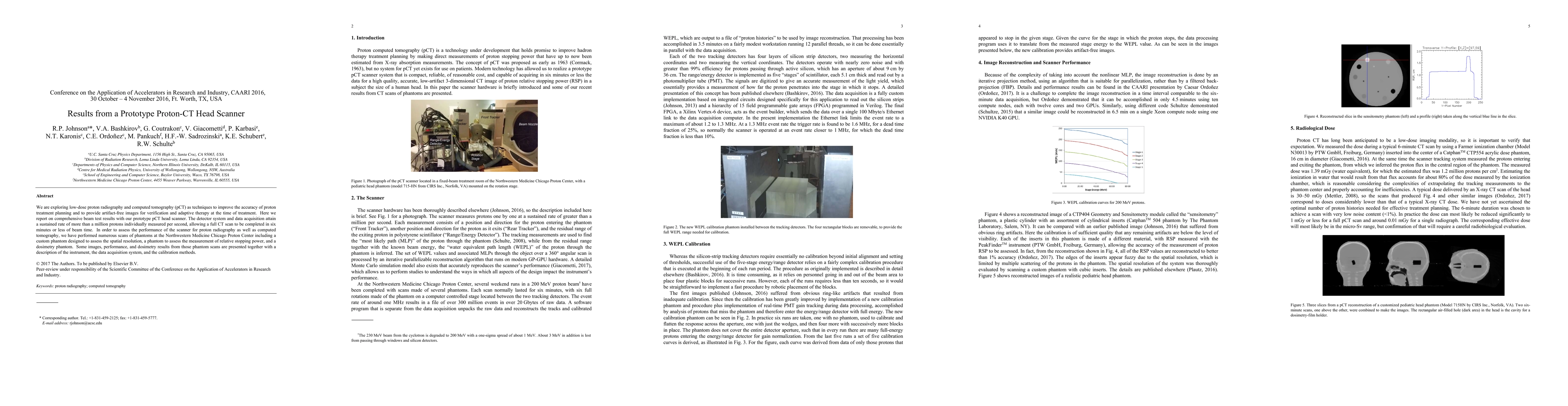 We are exploring low-dose proton radiography and computed tomography (pCT) as techniques to improve the accuracy of proton treatment planning and to provide artifact-free images for verification and adaptive therapy at the time of treatment. Here we report on comprehensive beam test results with our prototype pCT head scanner. The detector system and data acquisition attain a sustained rate of more than a million protons individually measured per second, allowing a full CT scan to be completed in six minutes or less of beam time. In order to assess the performance of the scanner for proton radiography as well as computed tomography, we have performed numerous scans of phantoms at the Northwestern Medicine Chicago Proton Center including a custom phantom designed to assess the spatial resolution, a phantom to assess the measurement of relative stopping power, and a dosimetry phantom. Some images, performance, and dosimetry results from those phantom scans are presented together with a description of the instrument, the data acquisition system, and the calibration methods.