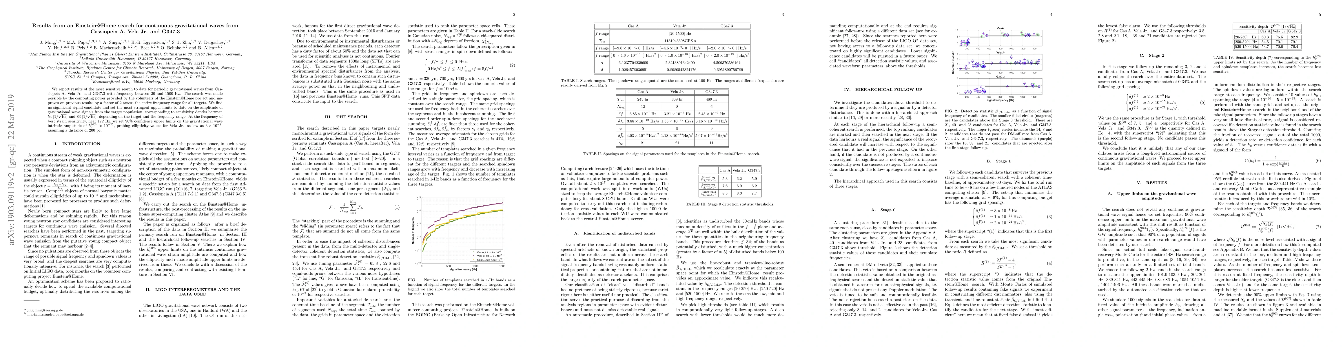 This study, conducted by the Einstein@Home project, reports the most sensitive search for continuous gravitational waves from Cassiopeia A, Vela Jr., and G347.3, with no significant signal detected. The research sets stringent upper limits on gravitational wave amplitudes, improving previous results by a factor of 2.