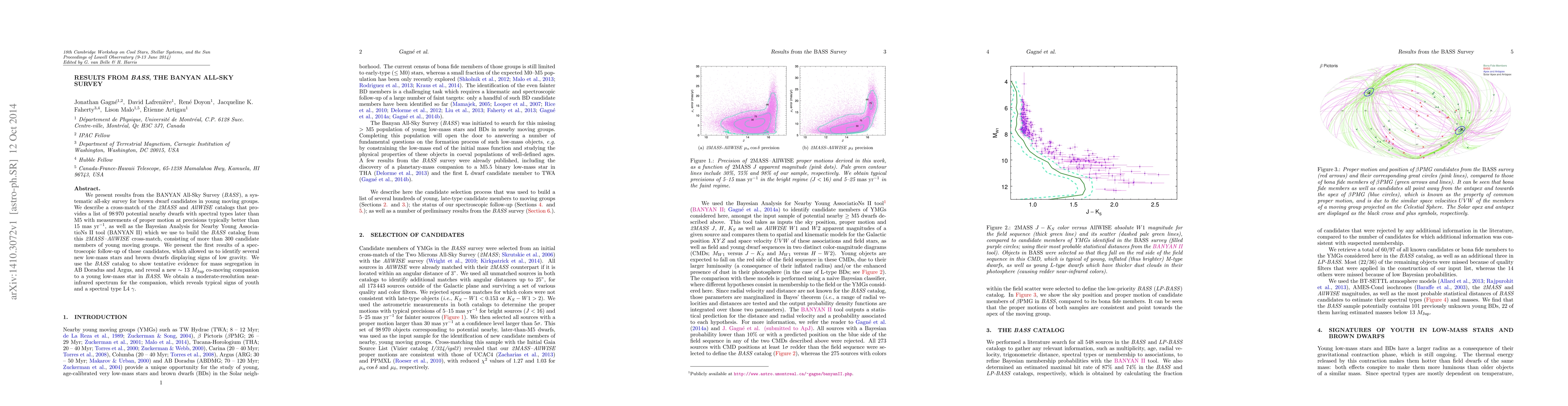 We present results from the BANYAN All-Sky Survey (BASS), a systematic all-sky survey for brown dwarf candidates in young moving groups. We describe a cross-match of the 2MASS and AllWISE catalogs that provides a list of 98 970 potential nearby dwarfs with spectral types later than M5 with measurements of proper motion at precisions typically better than 15 mas yr$^{-1}$, as well as the Bayesian Analysis for Nearby Young AssociatioNs II tool (BANYAN II) which we use to build the BASS catalog from this 2MASS-AllWISE cross-match, consisting of more than 300 candidate members of young moving groups. We present the first results of a spectroscopic follow-up of those candidates, which allowed us to identify several new low-mass stars and brown dwarfs displaying signs of low gravity. We use the BASS catalog to show tentative evidence for mass segregation in AB Doradus and Argus, and reveal a new $\sim$ 13 M$_{Jup}$ co-moving companion to a young low-mass star in BASS. We obtain a moderate-resolution near-infrared spectrum for the companion, which reveals typical signs of youth and a spectral type L4 $\gamma$.