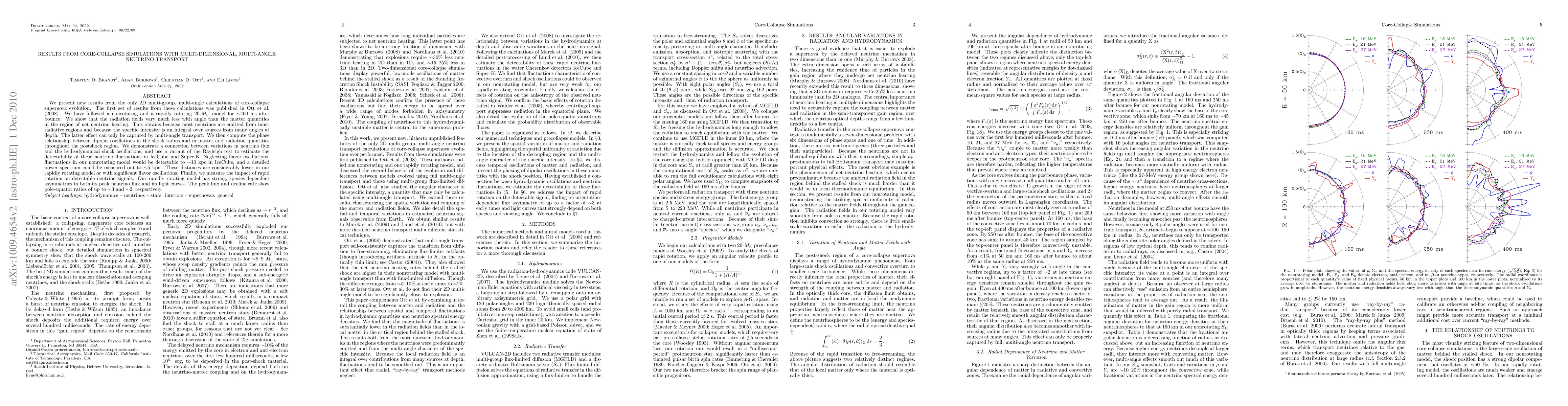 We present new results from the only 2D multi-group, multi-angle calculations of core-collapse supernova evolution. The first set of results from these calculations was published in Ott et al. (2008). We have followed a nonrotating and a rapidly rotating 20 solar mass model for ~400 ms after bounce. We show that the radiation fields vary much less with angle than the matter quantities in the region of net neutrino heating. This obtains because most neutrinos are emitted from inner radiative regions and because the specific intensity is an integral over sources from many angles at depth. The latter effect can only be captured by multi-angle transport. We then compute the phase relationship between dipolar oscillations in the shock radius and in matter and radiation quantities throughout the postshock region. We demonstrate a connection between variations in neutrino flux and the hydrodynamical shock oscillations, and use a variant of the Rayleigh test to estimate the detectability of these neutrino fluctuations in IceCube and Super-K. Neglecting flavor oscillations, fluctuations in our nonrotating model would be detectable to ~10 kpc in IceCube, and a detailed power spectrum could be measured out to ~5 kpc. These distances are considerably lower in our rapidly rotating model or with significant flavor oscillations. Finally, we measure the impact of rapid rotation on detectable neutrino signals. Our rapidly rotating model has strong, species-dependent asymmetries in both its peak neutrino flux and its light curves. The peak flux and decline rate show pole-equator ratios of up to ~3 and ~2, respectively.