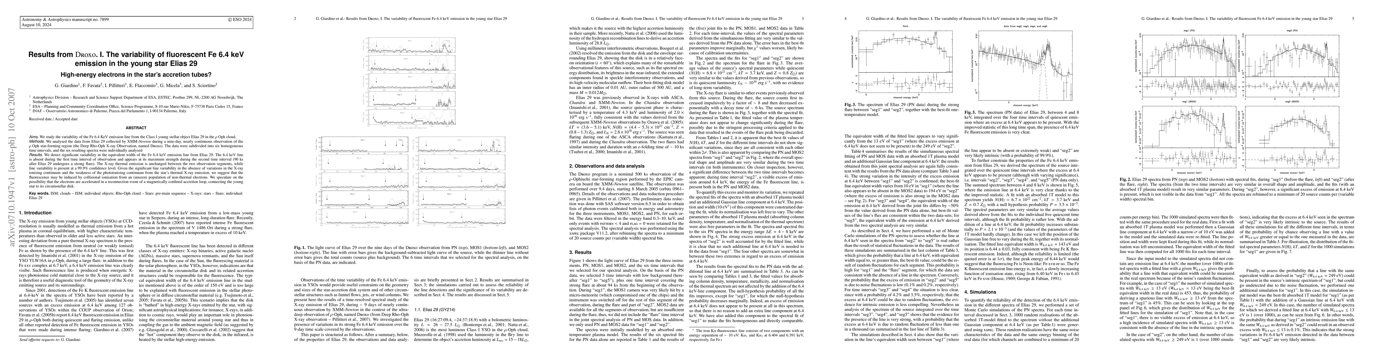 AIMS. We study the variability of the Fe 6.4 KeV emission line from the Class I young stellar object Elias 29 in the Rho-Oph cloud. METHODS. We analysed the data from Elias 29 collected by XMM during a nine-day, nearly continuous observation of the Rho-Oph star-forming region (the Deep Rho-Oph X-ray Observation, named Droxo). The data were subdivided into six homogeneous time intervals, and the six resulting spectra were individually analysed. RESULTS. We detect significant variability in the equivalent width of the Fe 6.4 keV emission line from Elias 29. The 6.4 keV line is absent during the first time interval of observation and appears at its maximum strength during the second time interval (90 ks after Elias 29 undergoes a strong flare). The X-ray thermal emission is unchanged between the two observation segments, while line variability is present at a 99.9% confidence level. Given the significant line variability in the absence of variations in the X-ray ionising continuum and the weakness of the photoionising continuum from the star's thermal X-ray emission, we suggest that the fluorescence may be induced by collisional ionisation from an (unseen) population of non-thermal electrons. We speculate on the possibility that the electrons are accelerated in a reconnection event of a magnetically confined accretion loop, connecting the young star to its circumstellar disk.