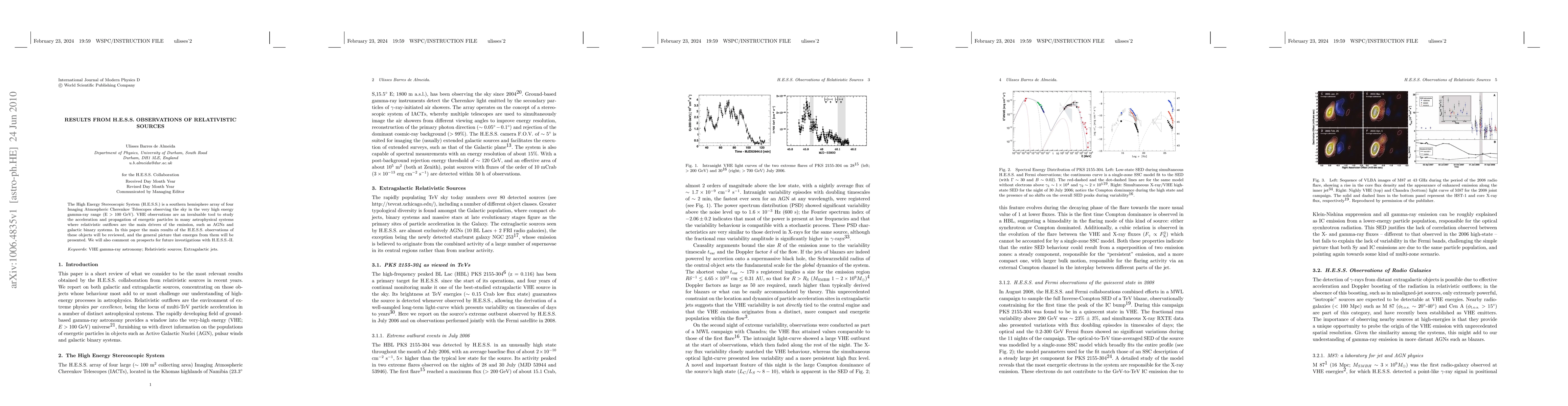 The High Energy Stereoscopic System (H.E.S.S.) is a southern hemisphere array of four Imaging Atmospheric Cherenkov Telescopes observing the sky in the very high energy gamma-ray range (E $>$ 100 GeV). VHE observations are an invaluable tool to study the acceleration and propagation of energetic particles in many astrophysical systems where relativistic outflows are the main drivers of the emission, such as AGNs and galactic binary systems. In this paper the main results of the H.E.S.S. observations of these objects will be reviewed, and the general picture that emerges from them will be presented. We will also comment on prospects for future investigations with H.E.S.S.-II.