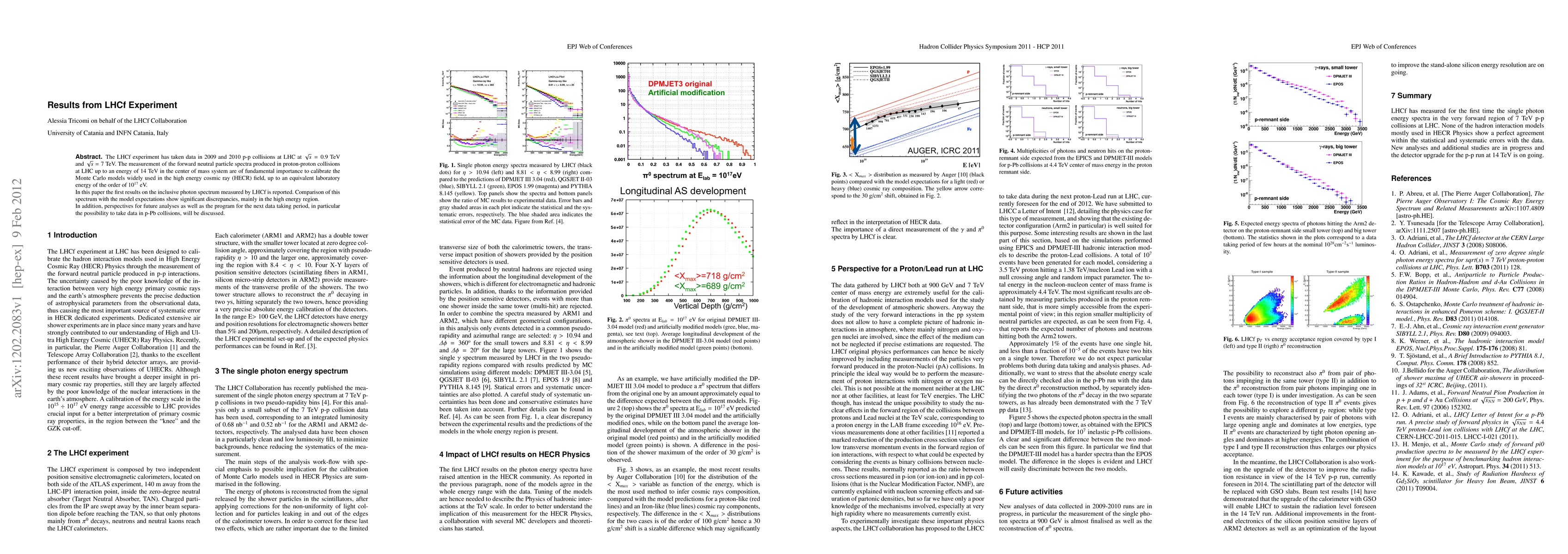 The LHCf experiment has taken data in 2009 and 2010 p-p collisions at LHC at $\sqrt{s} = 0.9$ TeV and $\sqrt{s} = 7$ TeV. The measurement of the forward neutral particle spectra produced in proton-proton collisions at LHC up to an energy of 14 TeV in the center of mass system are of fundamental importance to calibrate the Monte Carlo models widely used in the high energy cosmic ray (HECR) field, up to an equivalent laboratory energy of the order of $10^{17}$ eV. In this paper the first results on the inclusive photon spectrum measured by LHCf is reported. Comparison of this spectrum with the model expectations show significant discrepancies, mainly in the high energy region. In addition, perspectives for future analyses as well as the program for the next data taking period, in particular the possibility to take data in p-Pb collisions, will be discussed.