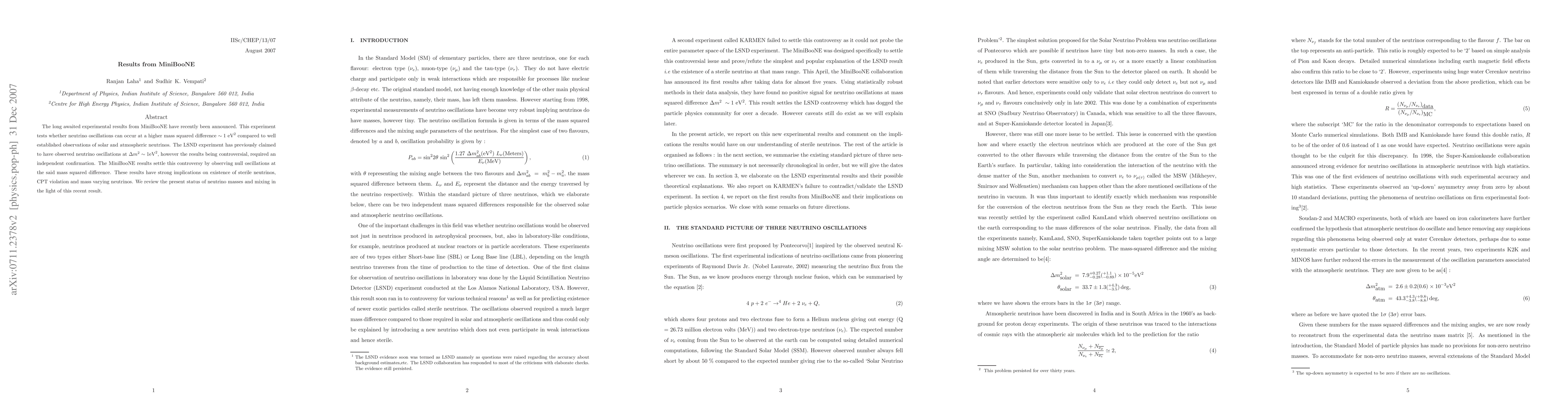 The long awaited experimental results from MiniBooNE have recently been announced. This experiment tests whether neutrino oscillations can occur at a higher mass squared difference $\sim1 {eV}^2$ compared to well established observations of solar and atmospheric neutrinos. The LSND experiment has previously claimed to have observed neutrino oscillations at $\Delta m^2 \sim 1 {eV}^2$, however the results being controversial, required an independent confirmation. The MiniBooNE results settle this controversy by observing null oscillations at the said mass squared difference. These results have strong implications on existence of sterile neutrinos, CPT violation and mass varying neutrinos. We review the present status of neutrino masses and mixing in the light of this recent result.