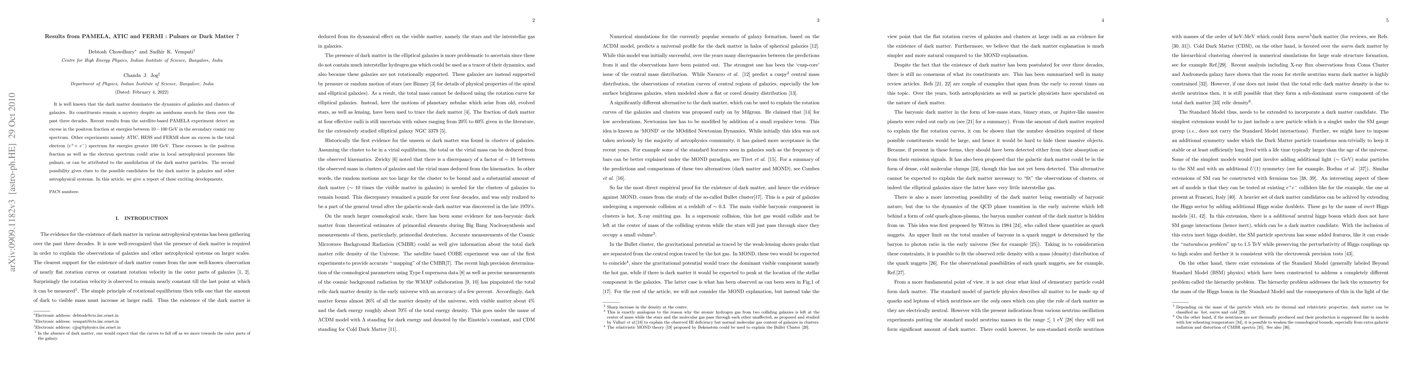 It is well known that the dark matter dominates the dynamics of galaxies and clusters of galaxies. Its constituents remain a mystery despite an assiduous search for them over the past three decades. Recent results from the satellite-based PAMELA experiment detect an excess in the positron fraction at energies between 10-100 GeV in the secondary cosmic ray spectrum. Other experiments namely ATIC, HESS and FERMI show an excess in the total electron (\ps + \el) spectrum for energies greater 100 GeV. These excesses in the positron fraction as well as the electron spectrum could arise in local astrophysical processes like pulsars, or can be attributed to the annihilation of the dark matter particles. The second possibility gives clues to the possible candidates for the dark matter in galaxies and other astrophysical systems. In this article, we give a report of these exciting developments.