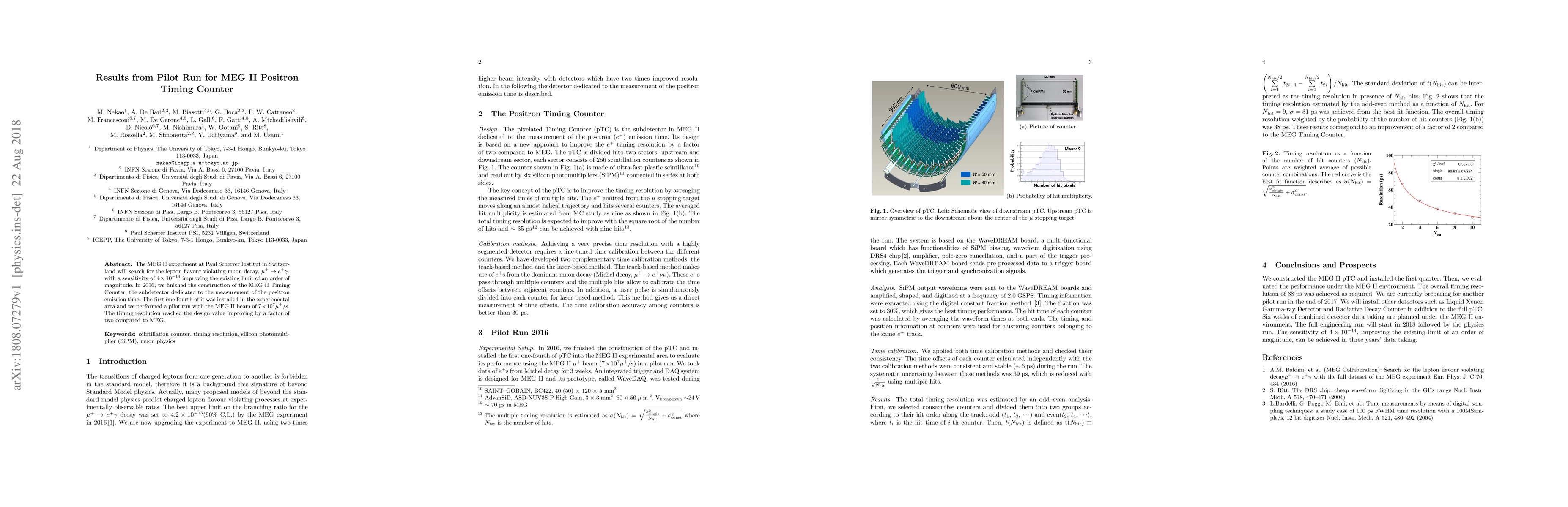 The MEG II experiment aims to detect the rare decay $\mu^+\to e^+\gamma$ with unprecedented sensitivity. A pilot run with the MEG II Timing Counter achieved the design timing resolution, doubling the performance of the previous MEG experiment.