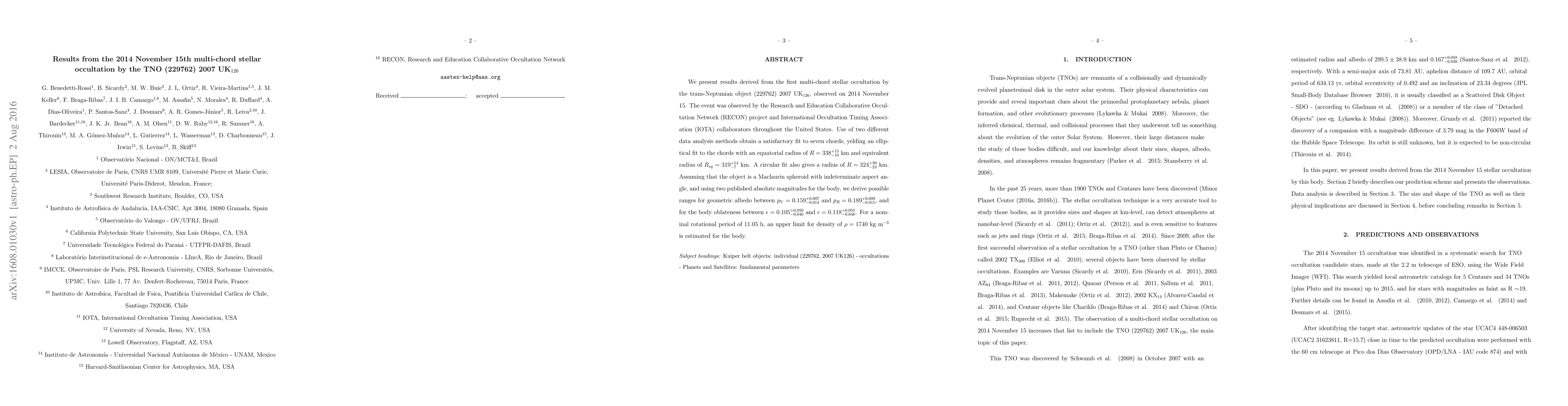 We present results derived from the first multi-chord stellar occultation by the trans-Neptunian object (229762) 2007 UK$_{126}$, observed on 2014 November 15. The event was observed by the Research and Education Collaborative Occultation Network (RECON) project and International Occultation Timing Association (IOTA) collaborators throughout the United States. Use of two different data analysis methods obtain a satisfactory fit to seven chords, yelding an elliptical fit to the chords with an equatorial radius of $R=338_{-10} ^{+15}$ km and equivalent radius of $R_{eq}=319_{-7} ^{+14}$ km. A circular fit also gives a radius of $R=324_{-23} ^{+30}$ km. Assuming that the object is a Maclaurin spheroid with indeterminate aspect angle, and using two published absolute magnitudes for the body, we derive possible ranges for geometric albedo between $p_{V}=0.159_{-0.013} ^{+0.007}$ and $p_{R}=0.189_{-0.015}^{+0.009}$, and for the body oblateness between $\epsilon=0.105_{-0.040} ^{+0.050}$ and $\epsilon=0.118_{-0.048} ^{+0.055}$. For a nominal rotational period of 11.05 h, an upper limit for density of $\rho=1740$ kg~m$^{-3}$ is estimated for the body.