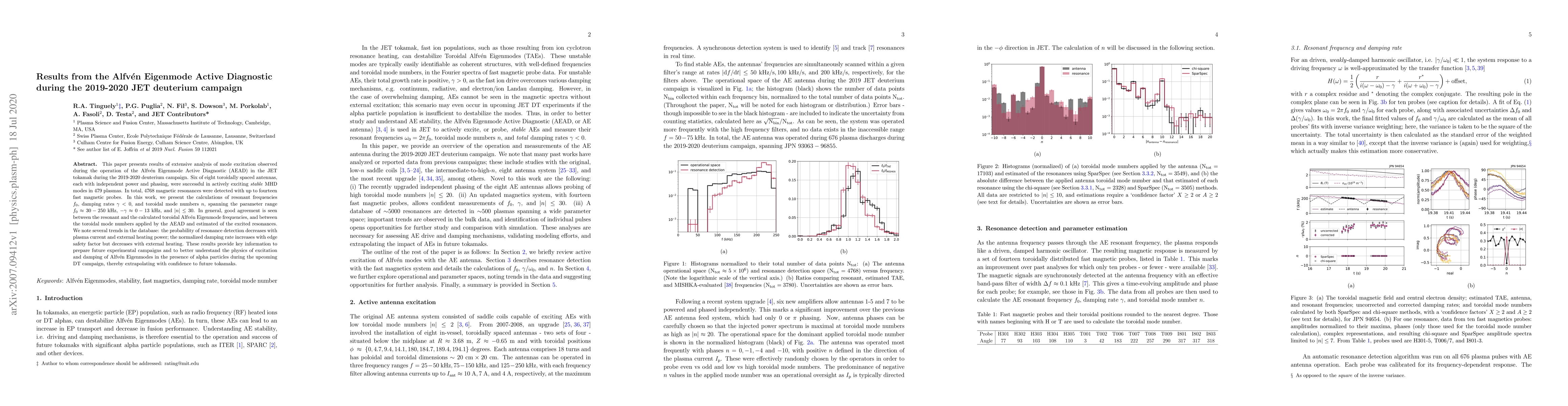 This paper presents results of extensive analysis of mode excitation observed during the operation of the Alfv\'{e}n Eigenmode Active Diagnostic (AEAD) in the JET tokamak during the 2019-2020 deuterium campaign. Six of eight toroidally spaced antennas, each with independent power and phasing, were successful in actively exciting stable MHD modes in 479 plasmas. In total, 4768 magnetic resonances were detected with up to fourteen fast magnetic probes. In this work, we present the calculations of resonant frequencies $f_0$, damping rates $\gamma < 0$, and toroidal mode numbers $n$, spanning the parameter range $f_0 \approx$ 30 - 250 kHz, $-\gamma \approx$ 0 - 13 kHz, and $\vert n \vert \leq 30$. In general, good agreement is seen between the resonant and the calculated toroidal Alfv\'{e}n Eigenmode frequencies, and between the toroidal mode numbers applied by the AEAD and estimated of the excited resonances. We note several trends in the database: the probability of resonance detection decreases with plasma current and external heating power; the normalized damping rate increases with edge safety factor but decreases with external heating. These results provide key information to prepare future experimental campaigns and to better understand the physics of excitation and damping of Alfv\'{e}n Eigenmodes in the presence of alpha particles during the upcoming DT campaign, thereby extrapolating with confidence to future tokamaks.