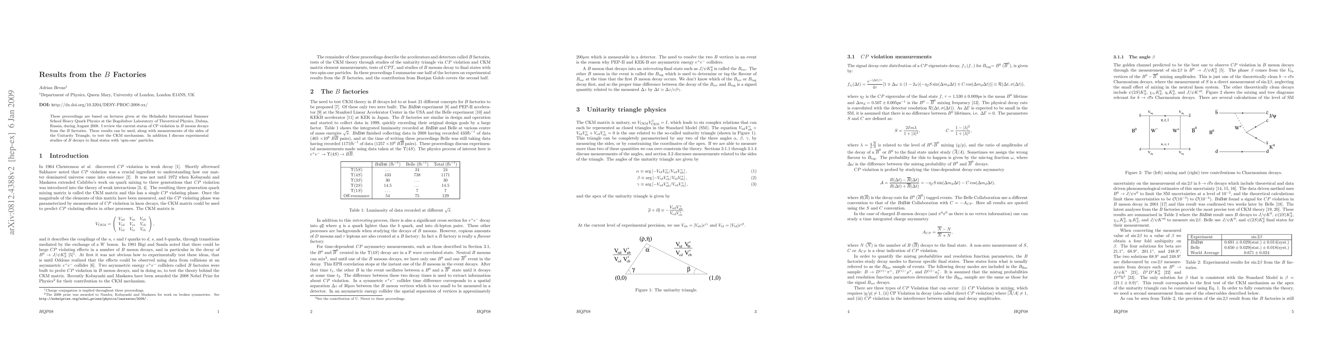 These proceedings are based on lectures given at the Helmholtz International Summer School Heavy Quark Physics at the Bogoliubov Laboratory of Theoretical Physics, Dubna, Russia, during August 2008. I review the current status of CP violation in B meson decays from the B factories. These results can be used, along with measurements of the sides of the Unitarity Triangle, to test the CKM mechanism. In addition I discuss experimental studies of B decays to final states with `spin-one' particles.