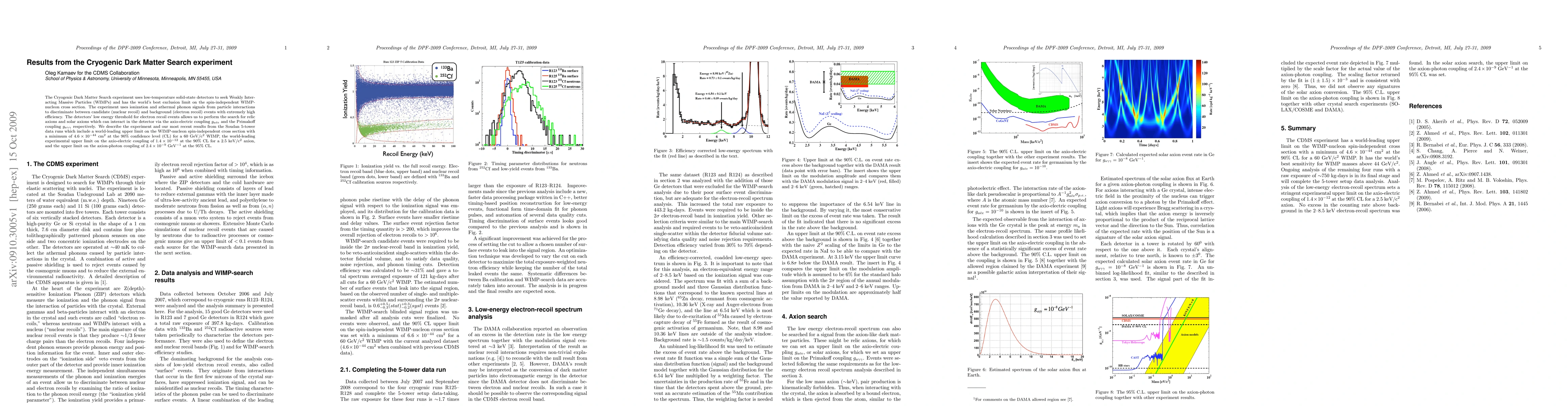 The Cryogenic Dark Matter Search experiment employs low-temperature detectors to search for Weakly Interacting Massive Particles (WIMPs) and relic axions, achieving world-leading limits on WIMP-nucleon cross sections and axion couplings. The results include a minimum WIMP-nucleon cross section limit of $4.6\times10^{-44}$ cm$^{2}$ at 90% CL for a 60 GeV/c$^{2}$ WIMP.