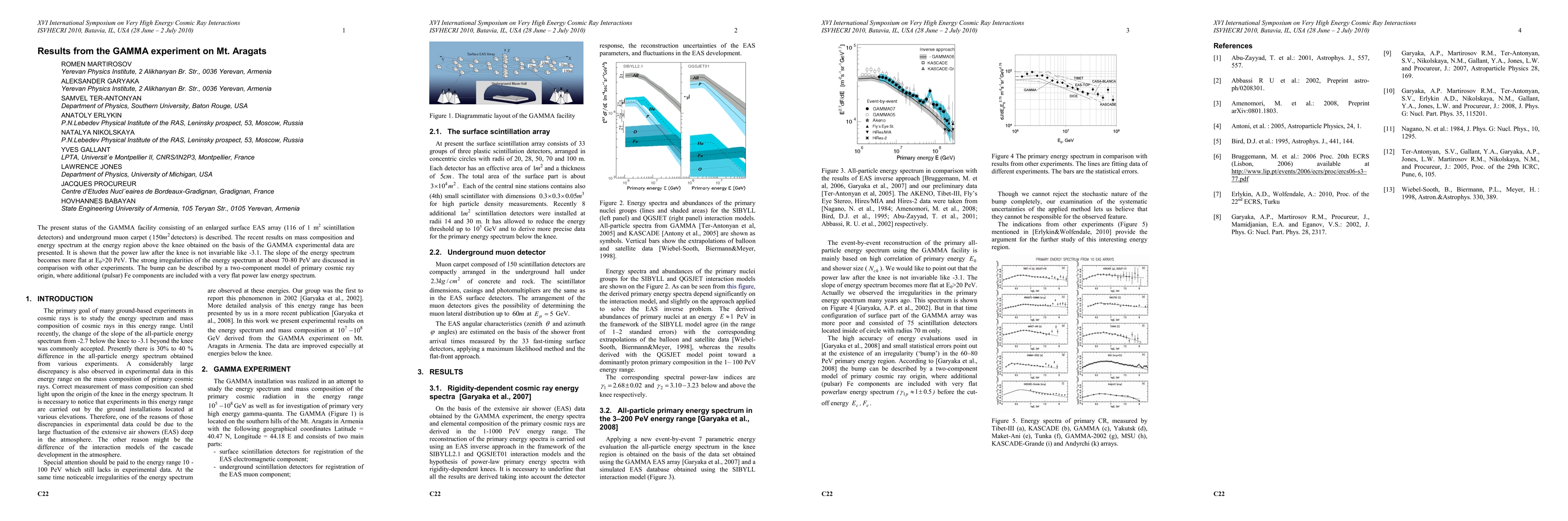 The present status of the GAMMA facility consisting of an enlarged surface EAS array (116 of 1 m^2 scintillation detectors) and underground muon carpet (150 m^2 detectors) is described. The recent results on mass composition and energy spectrum at the energy region above the knee obtained on the basis of the GAMMA experimental data are presented. It is shown that the power law after the knee is not invariable like -3.1. The slope of the energy spectrum becomes more flat at E0>20 PeV. The strong irregularities of the energy spectrum at about 70-80 PeV are discussed in comparison with other experiments. The bump can be described by a two-component model of primary cosmic ray origin, where additional (pulsar) Fe components are included with a very flat power law energy spectrum.