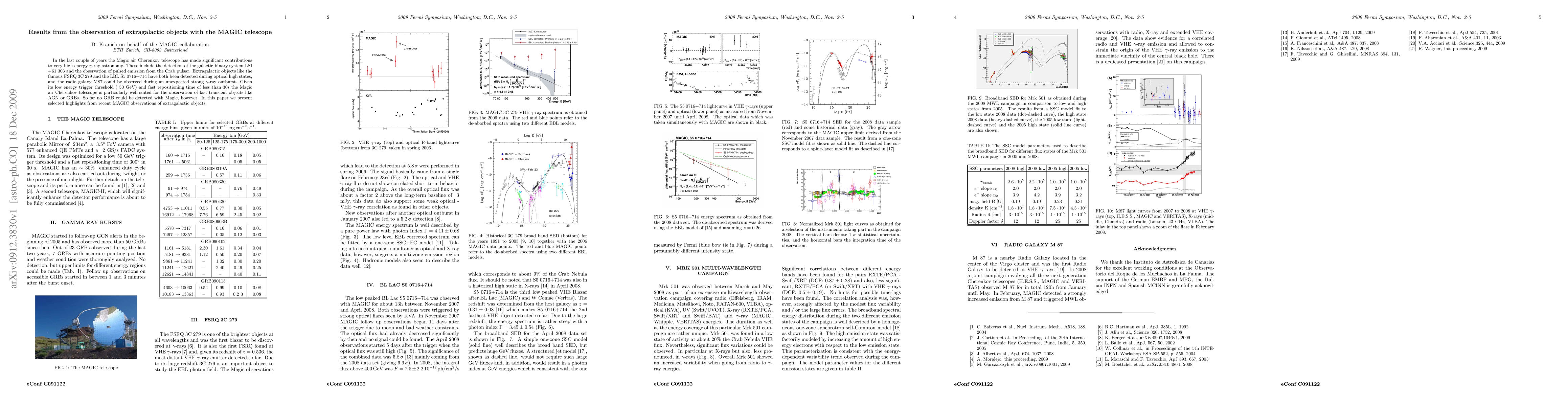 In the last couple of years the Magic air Cherenkov telescope has made significant contributions to very high energy $\gamma$-ray astronomy. These include the detection of the galactic binary system LSI +61 303 and the observation of pulsed emission from the Crab pulsar. Extragalactic objects like the famous FSRQ 3C 279 and the LBL S5 0716+714 have both been detected during optical high states, and the radio galaxy M87 could be observed during an unexpected strong $\gamma$-ray outburst. Given its low energy trigger threshold (~50 GeV) and fast repositioning time of less than 30s the Magic air Cherenkov telescope is particularly well suited for the observation of fast transient objects like AGN or GRBs. So far no GRB could be detected with Magic, however. In this paper we present selected highlights from recent MAGIC observations of extragalactic objects.