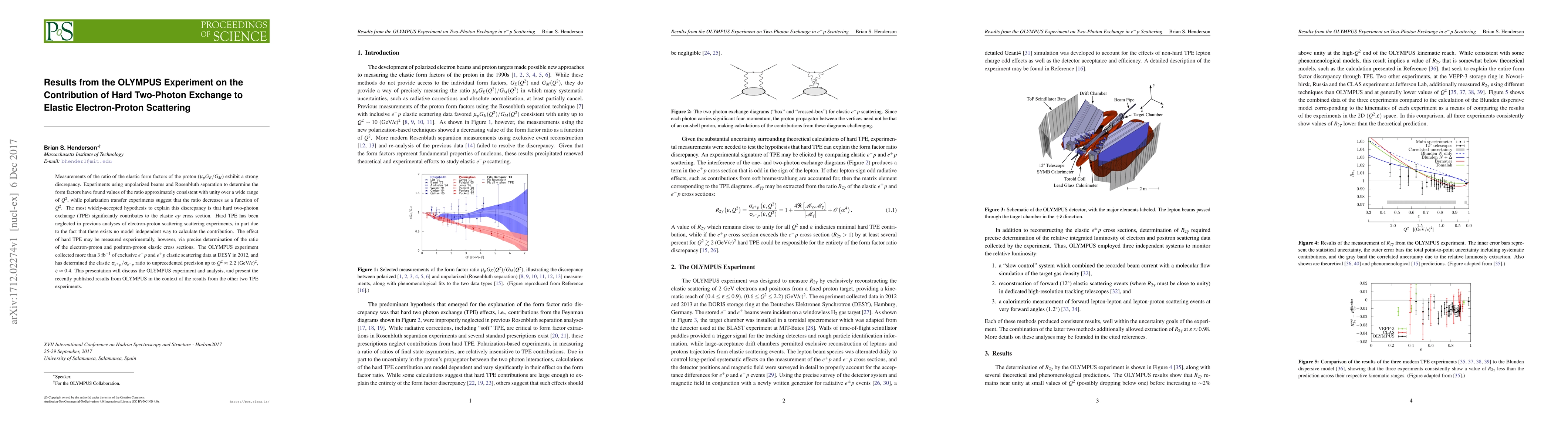 The OLYMPUS experiment measured the ratio of elastic electron-proton to positron-proton scattering to investigate the contribution of hard two-photon exchange (TPE) to this process. The results from the experiment provide unprecedented precision on this ratio, suggesting that hard TPE may help resolve discrepancies in the proton's elastic form factor measurements.
