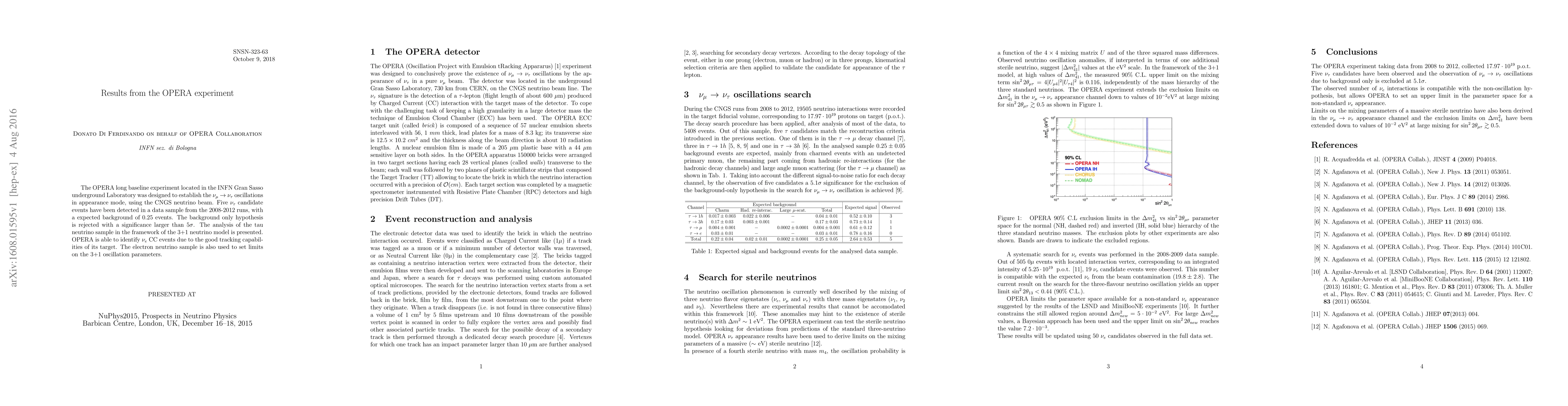 The OPERA experiment detected five $\nu_{\tau}$ candidate events, significantly exceeding the expected background, confirming $\nu_{\mu}$ to $\nu_{\tau}$ oscillations with over 5$\sigma$ significance. The experiment also set limits on 3+1 neutrino oscillation parameters using $\nu_{e}$ charged current events.