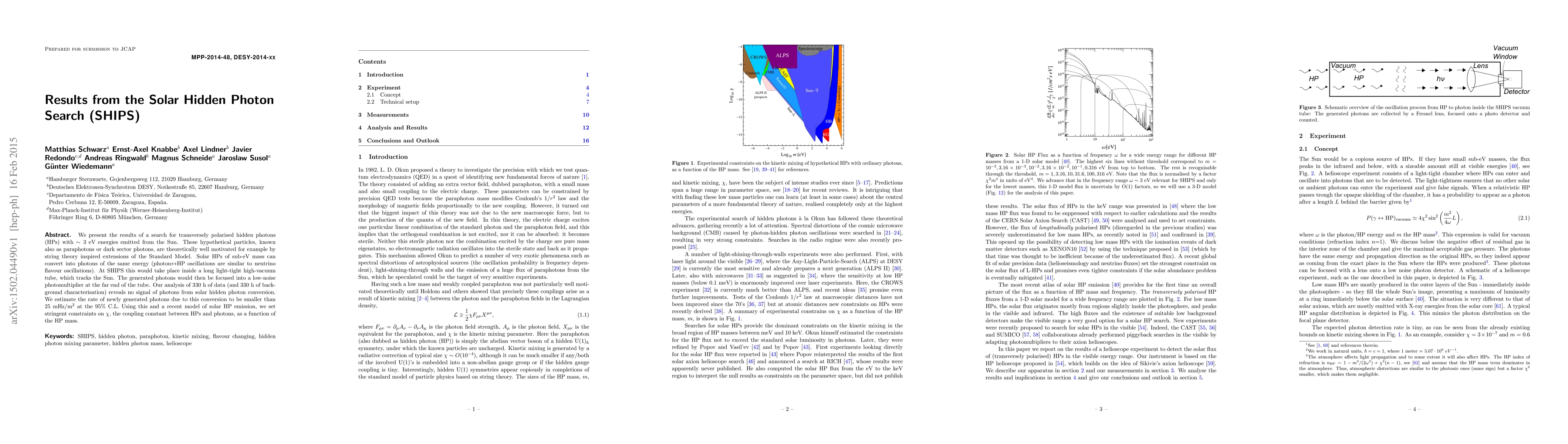 The SHIPS experiment searched for solar hidden photons with energies around 3 eV, finding no evidence of their conversion into standard photons. The study sets stringent constraints on the coupling constant between hidden photons and photons as a function of hidden photon mass.